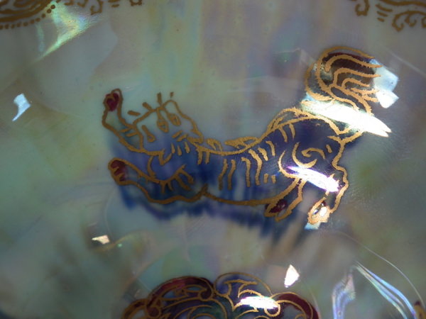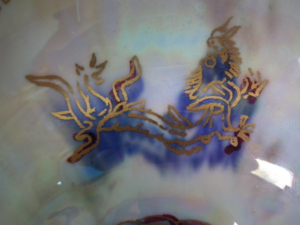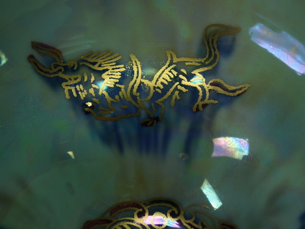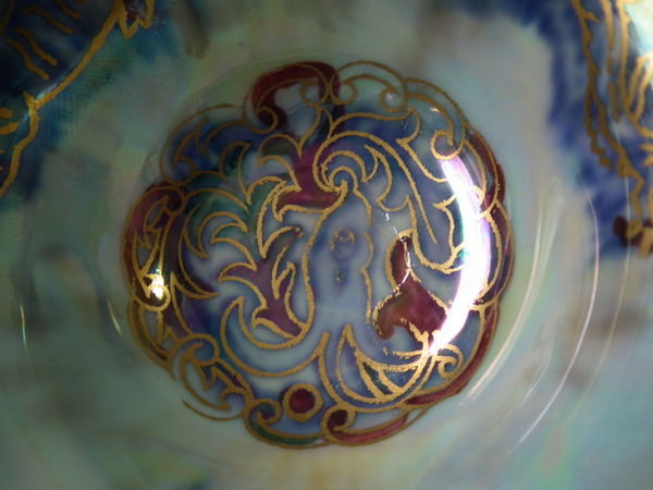 Mother of pearl lustre to interior, decorated with three small dragons. Blue lustre exterior with three small dragons.