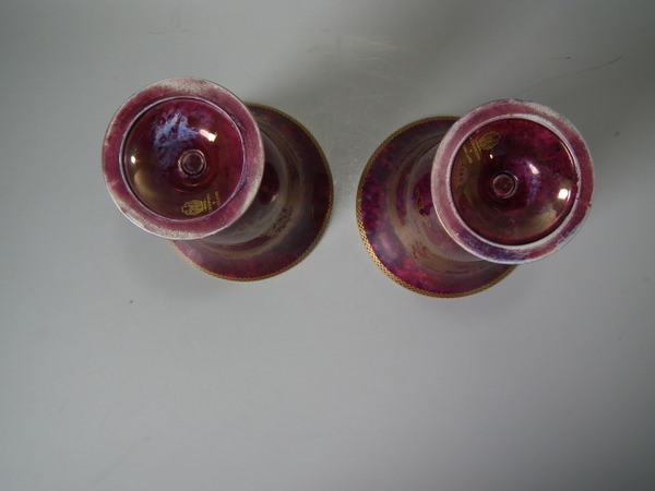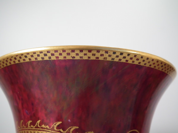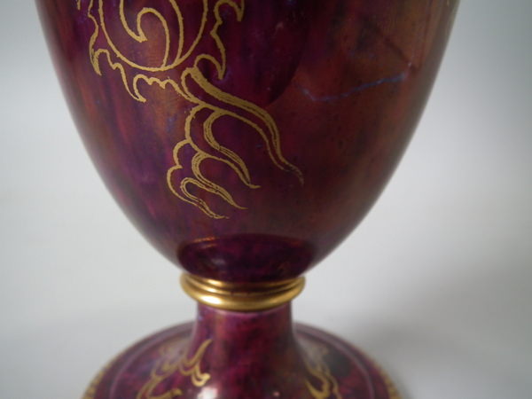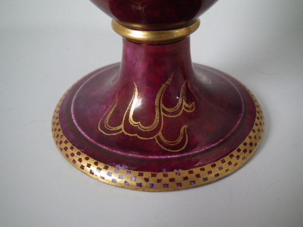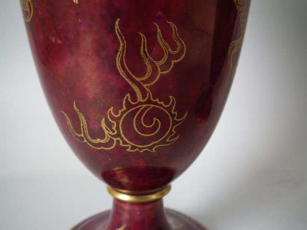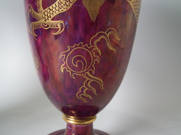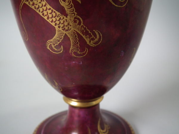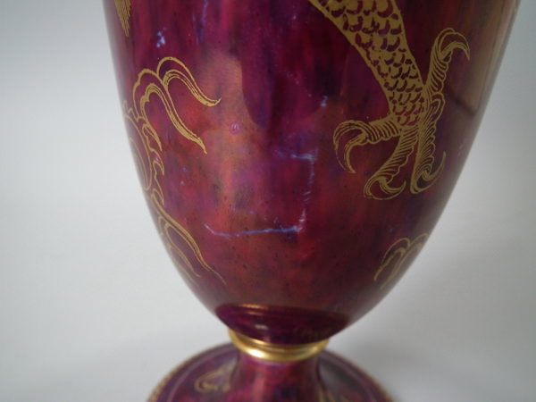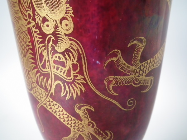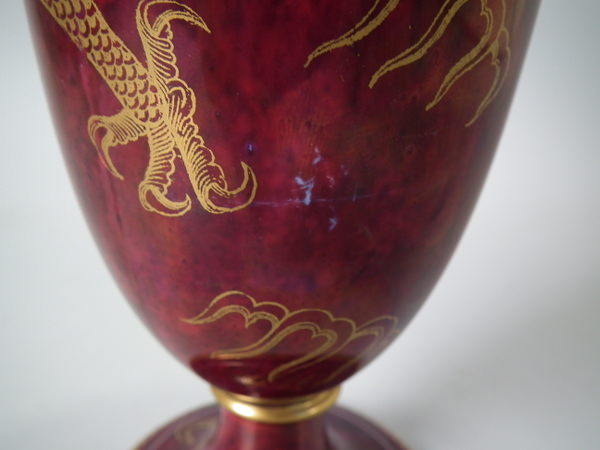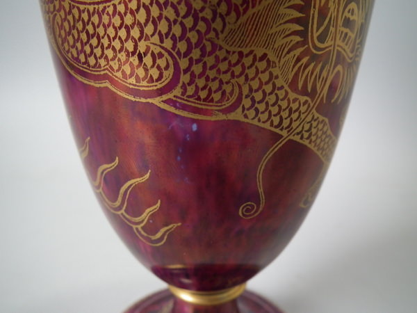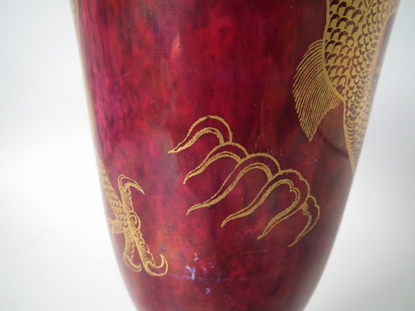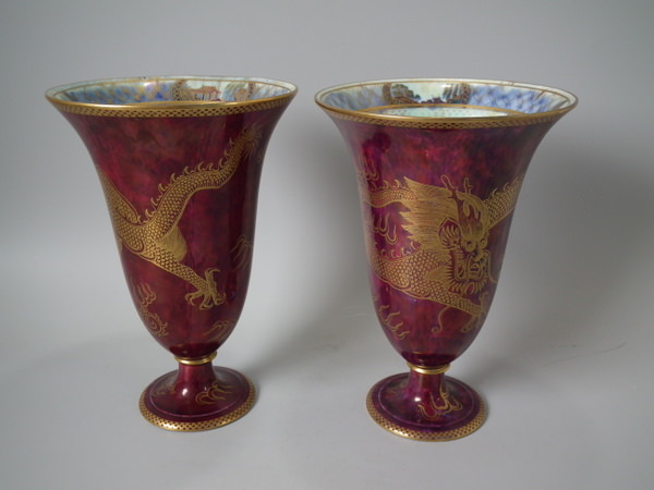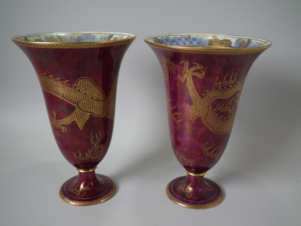 Circa 1920. 8.6 ins high, 6ins wide. Pair of Wedgwood dragon lustre vases, shape number 2357. Vase decorated with a celestial dragon and sacred pearl with flames motif on a ruby ground.