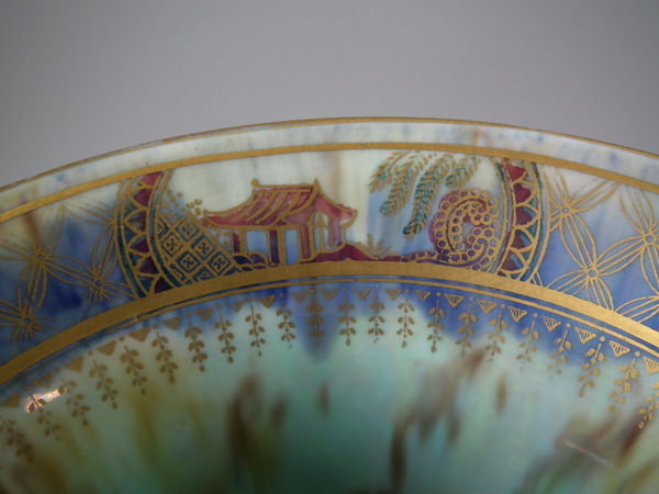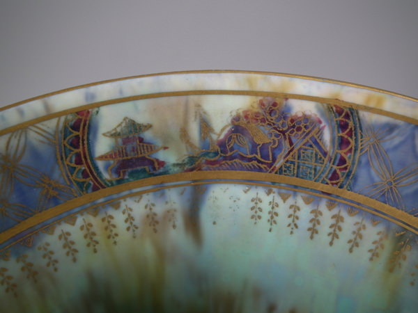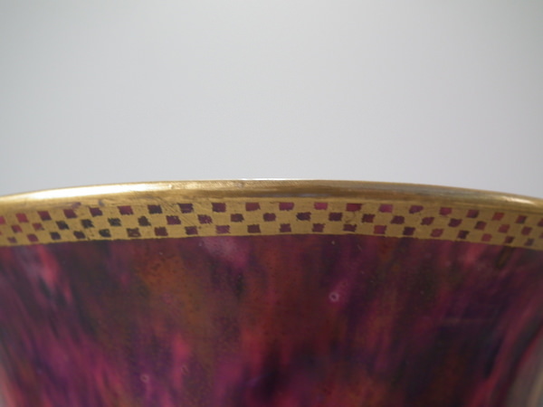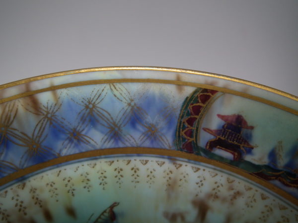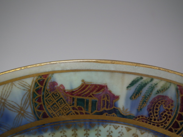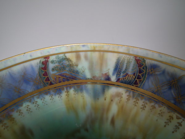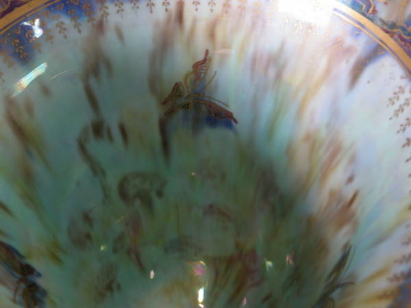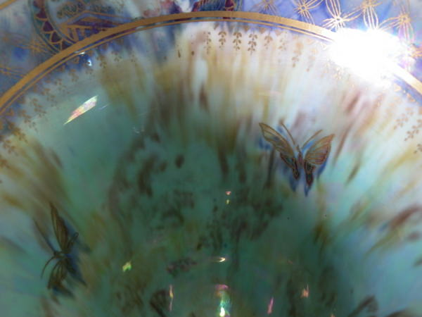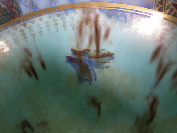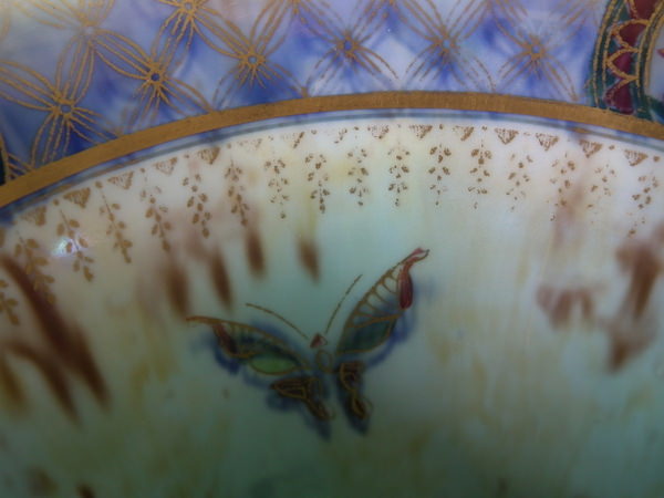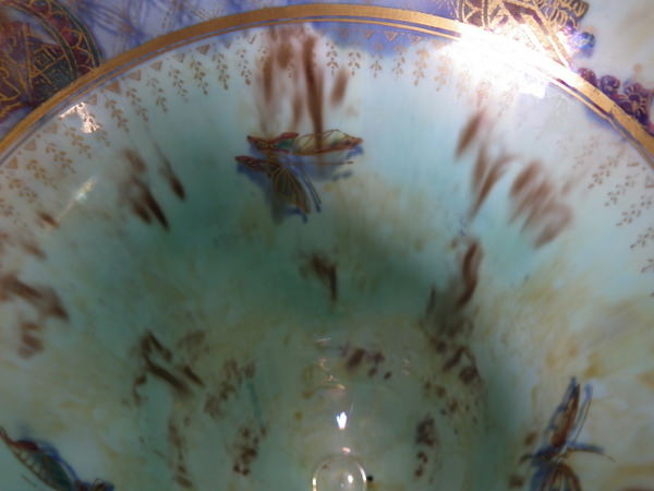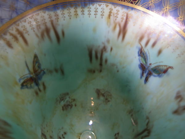Checkered gilt border around the rim and footrim. Mother of pearl interior with Papillon border and butteflies.