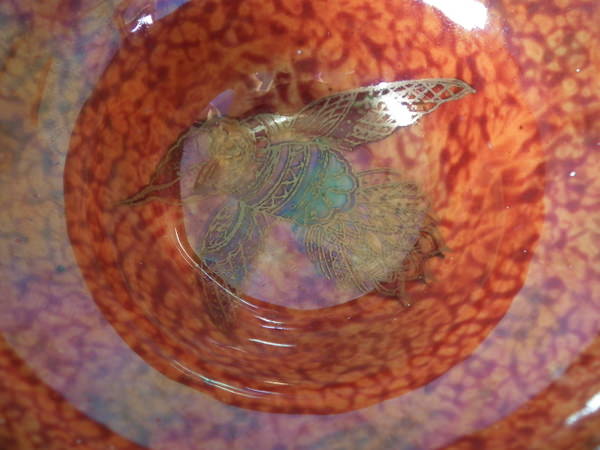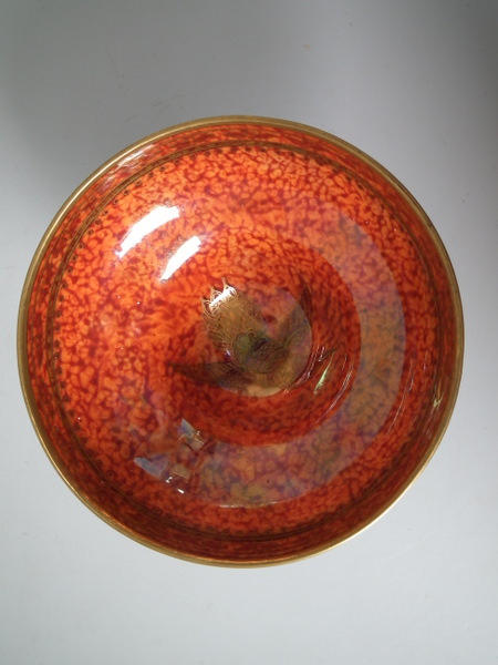 Orange lustre interior decorated with a flying hummingbird to the centre, blue lustre exterior with three hummingbirds. Flying geese border to the foot rim.