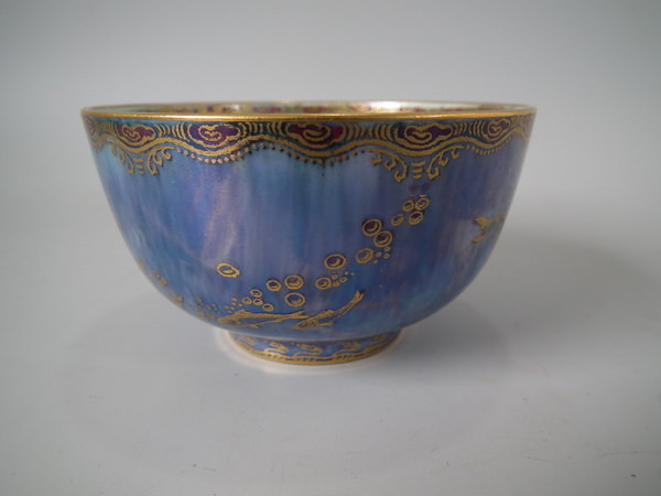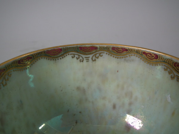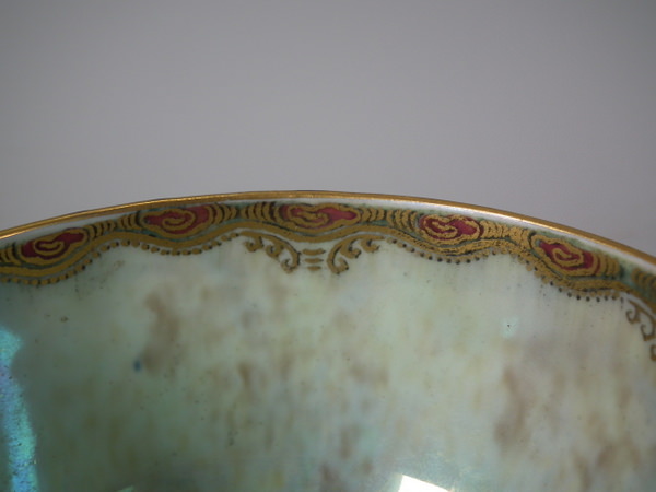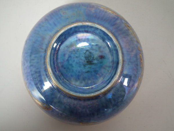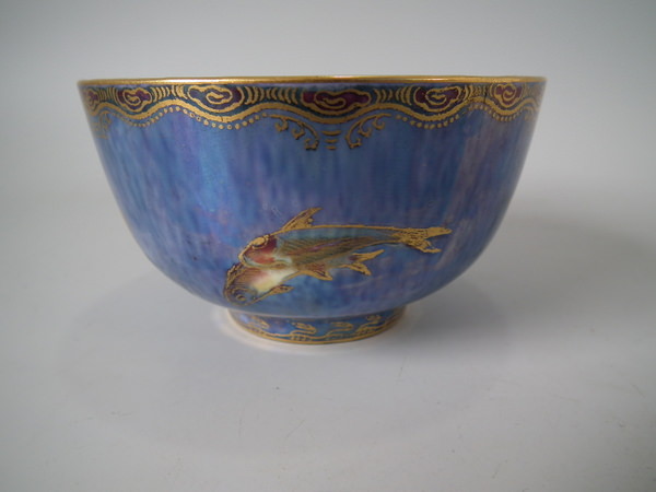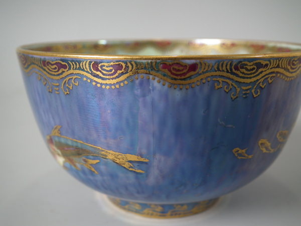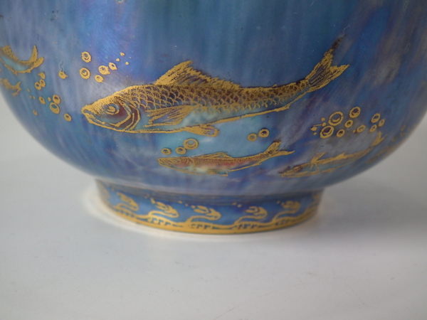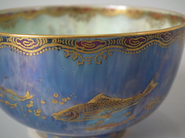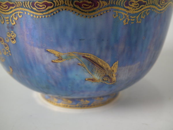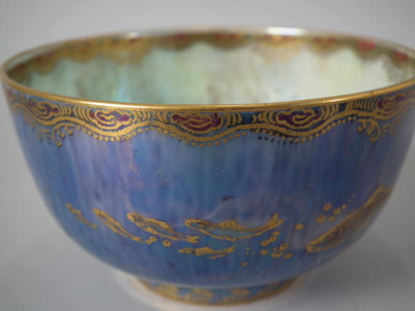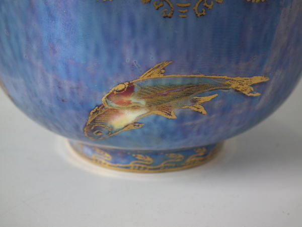 Mottled blue exterior decorated with fish. Gilt aquatic bead border around the inside and outside of the rim.