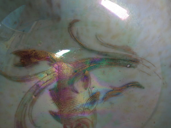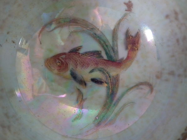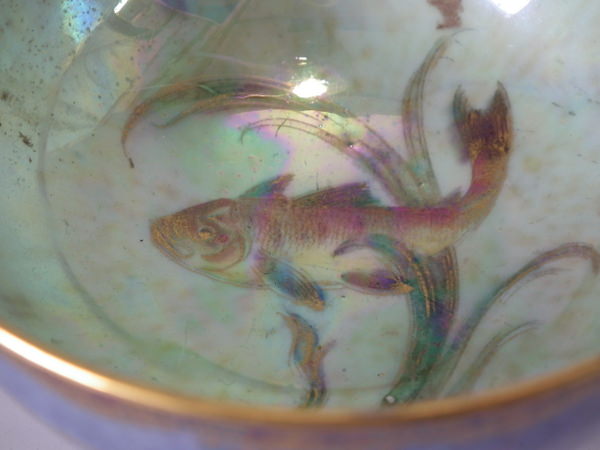 Circa 1920. 2.5ins high by 4ins wide. Small Wedgwood fish lustre bowl. Mottled cream interior decorated with a koi carp swimming amongst pond weed in the center.