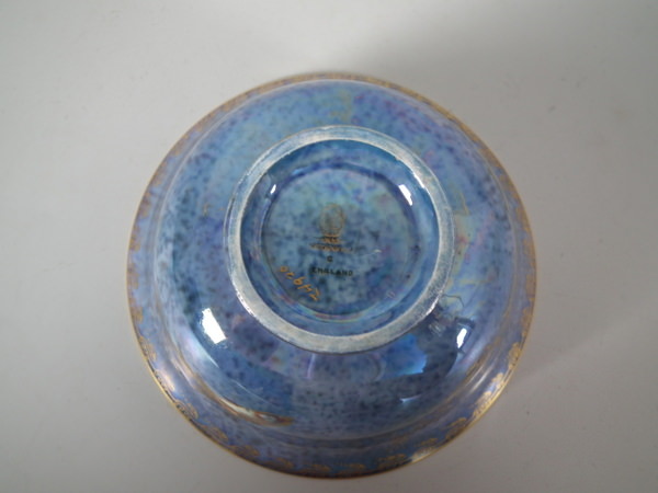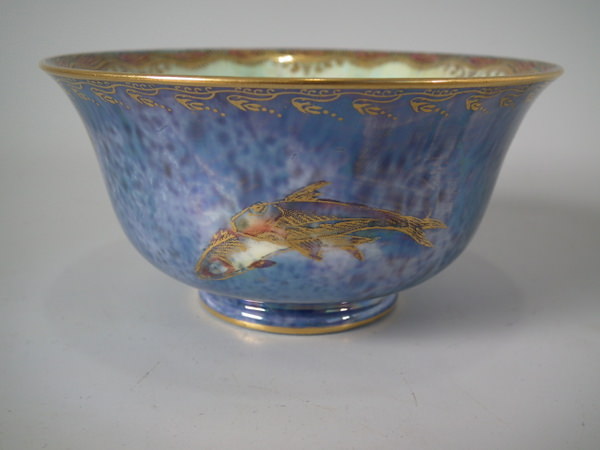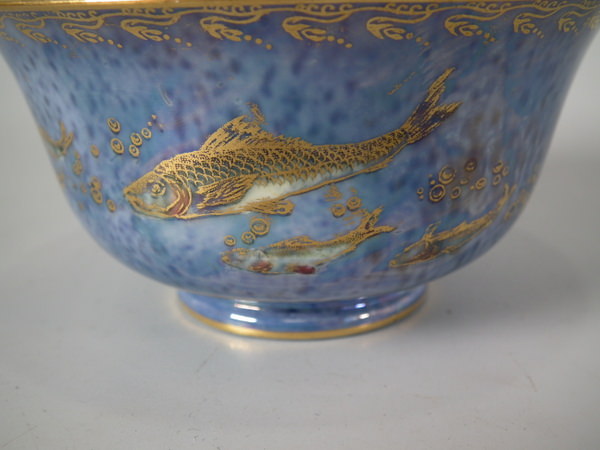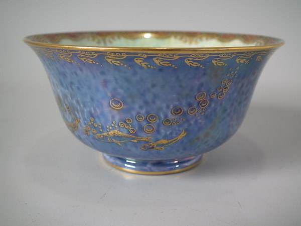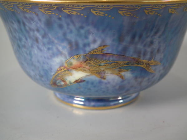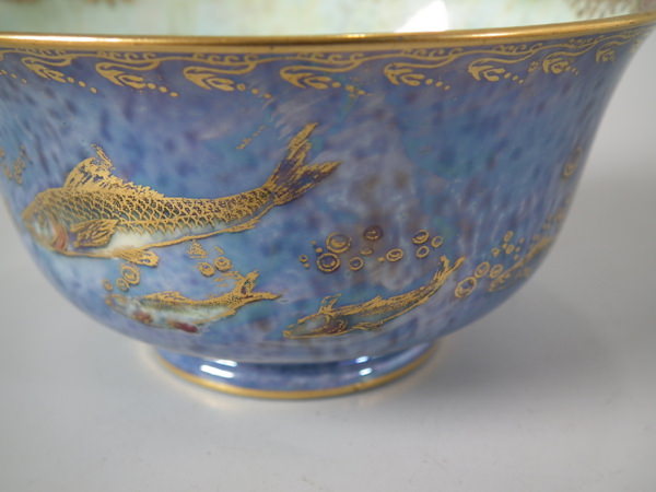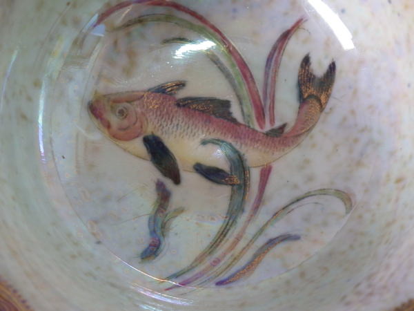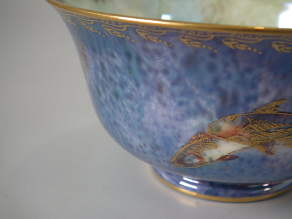Mottled blue exterior decorated with fish. Gilt aquatic bead border around the inside of the rim.