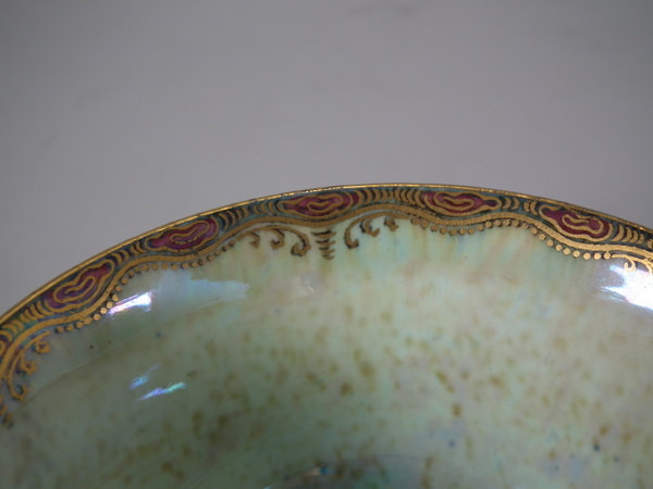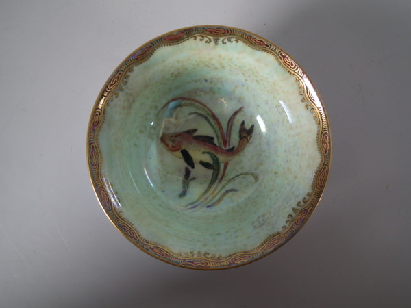 Circa 1920. 2 ins high, by 4 ins wide. Small Wedgwood fish lustre bowl. Mottled cream interior decorated with a koi carp swimming amongst pond weed in the center.
