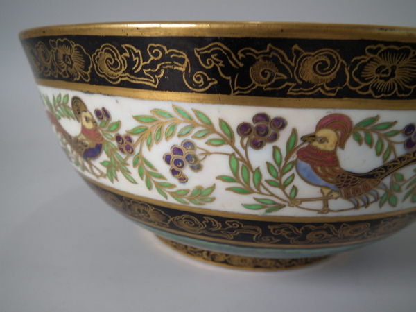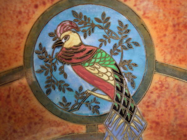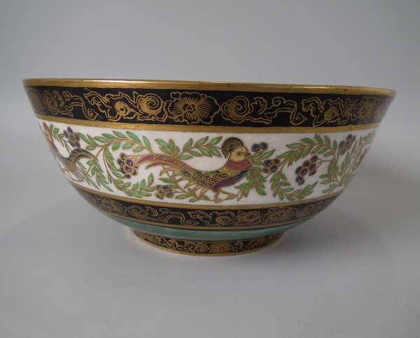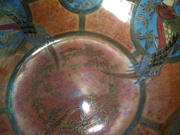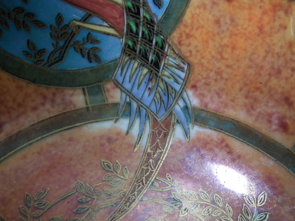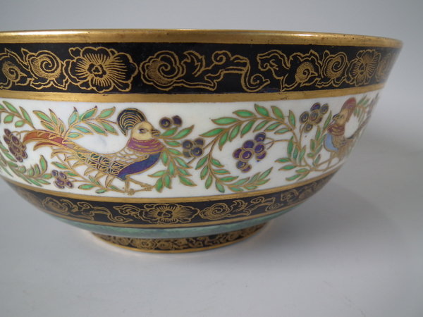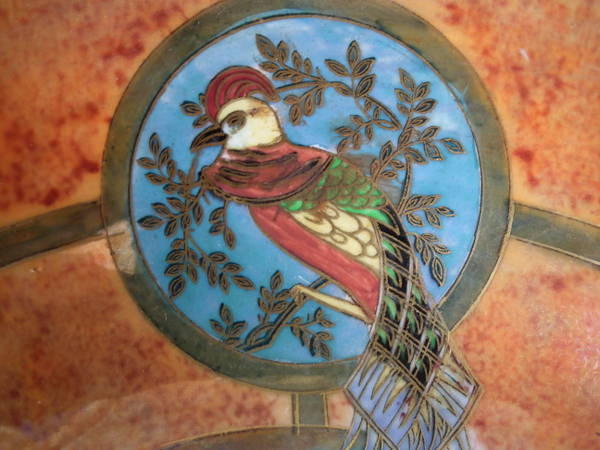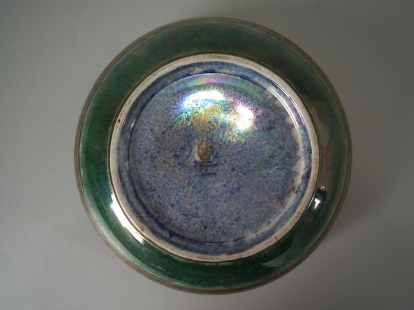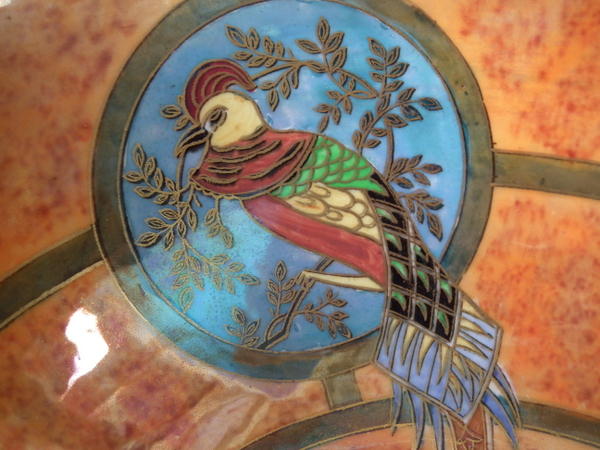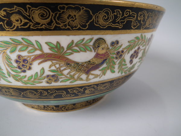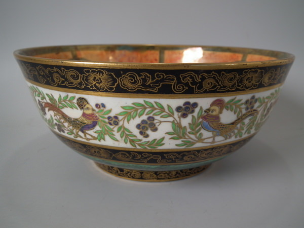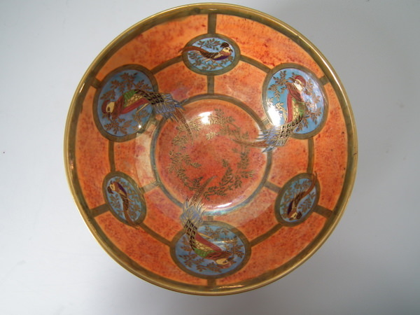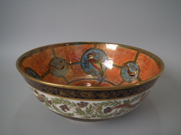 Circa 1920. 4ins high. Wedgwood lustre bowl decorated with Amherst Pheasant pattern and dragon bead border.