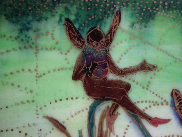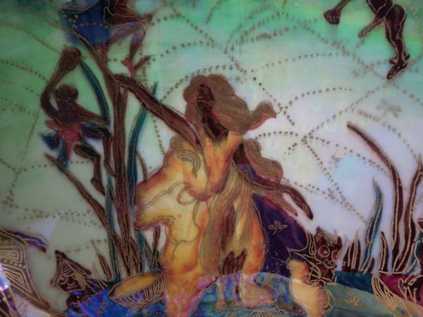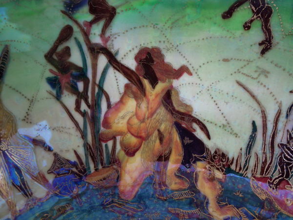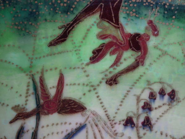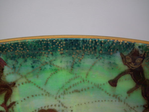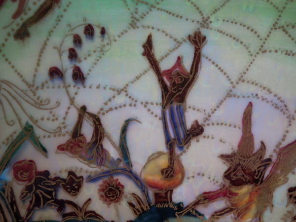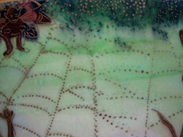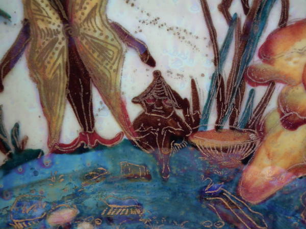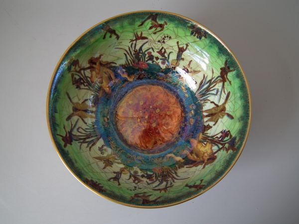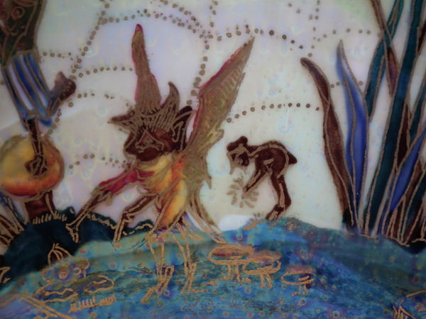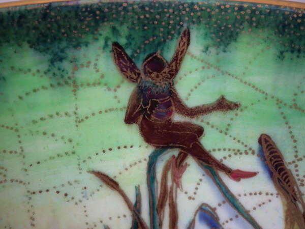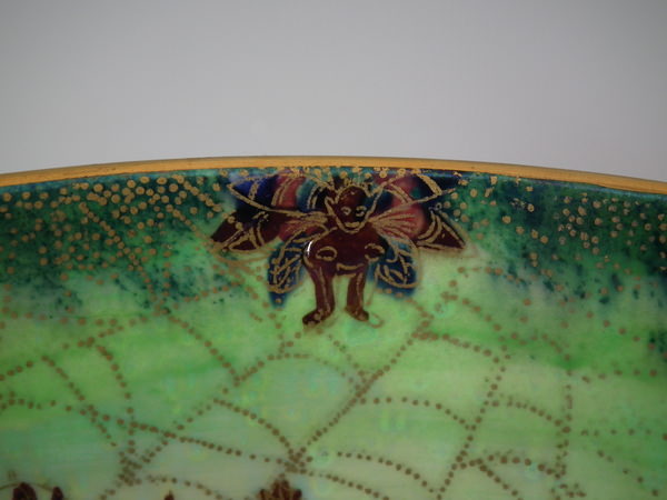 The 'Elves and bell branch' design on a mother of pearl ground to the interior.