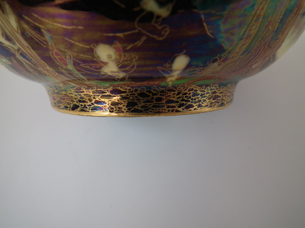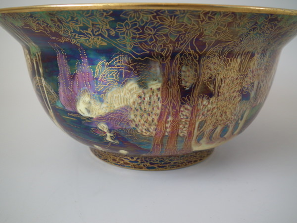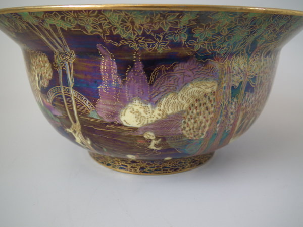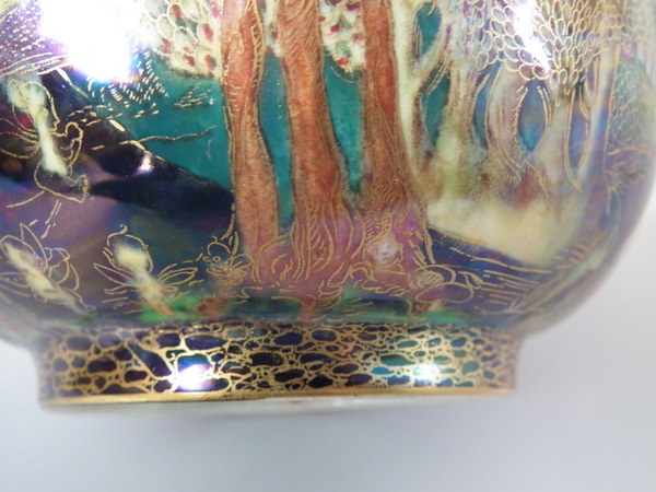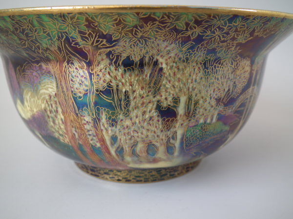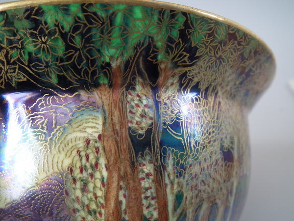 Circa 1920. 3.25ins by 7.25ins wide. Wedgwood Fairyland lustre K'ang Hsi bowl decorated in the 'Woodland Bridge' design on black ground to the exterior.