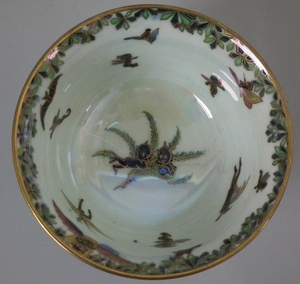 Circa 1920. 4.75ins diameter, 2.5ins high. Wedgwood Fairyland Lustre York Cup decorated with the 'Leapfrogging Elves' design on black ground to the exterior. 'Elves on a Branch' design on mother of pearl ground to interior.