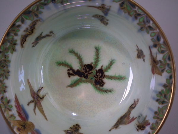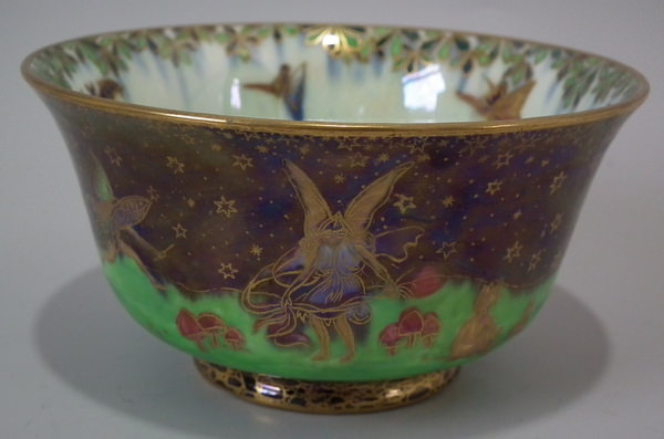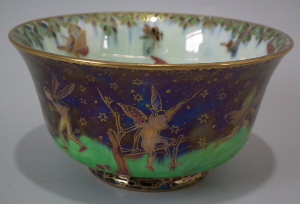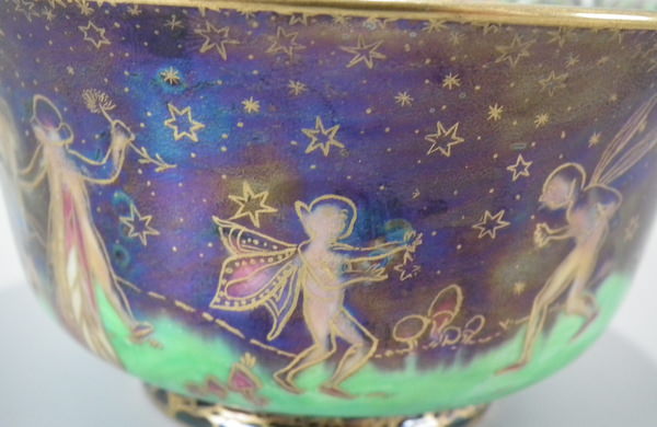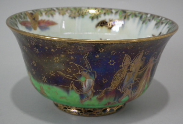 Circa 1920. 4.75ins diameter, 2.5ins high. Wedgwood Fairyland Lustre York Cup decorated with the 'Leapfrogging Elves' design on black ground to the exterior. 'Elves on a Branch' design on mother of pearl ground to interior. 'Cobble Bead' border to the foot rim.