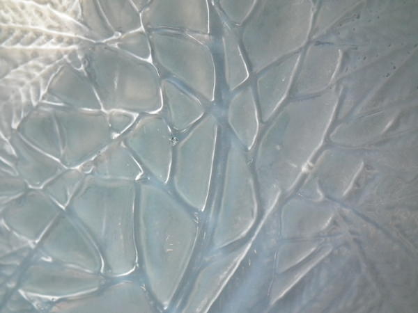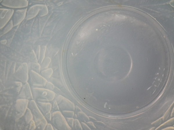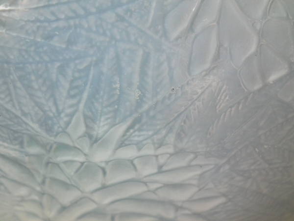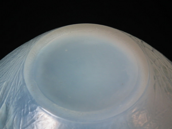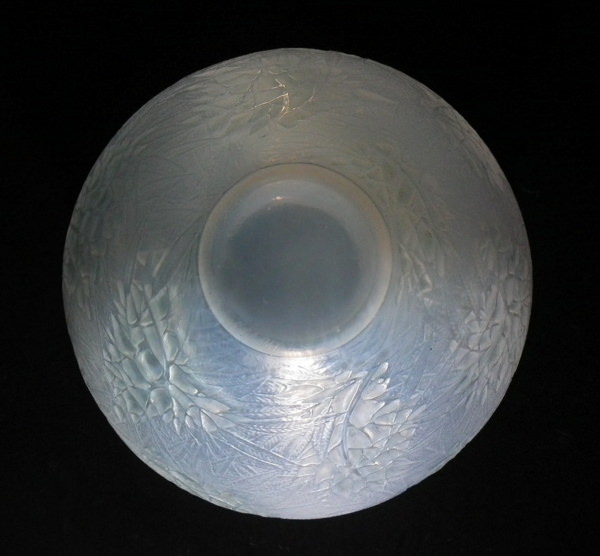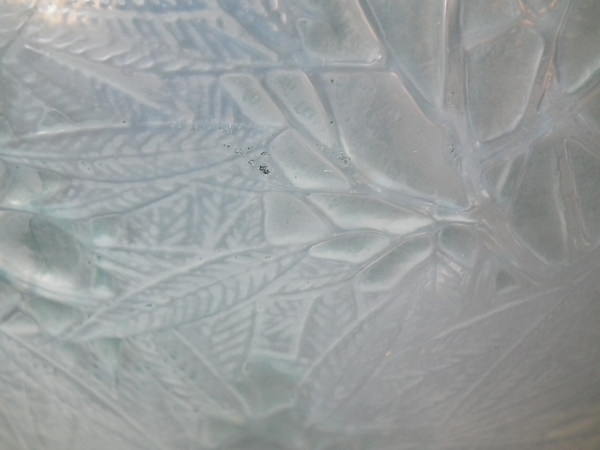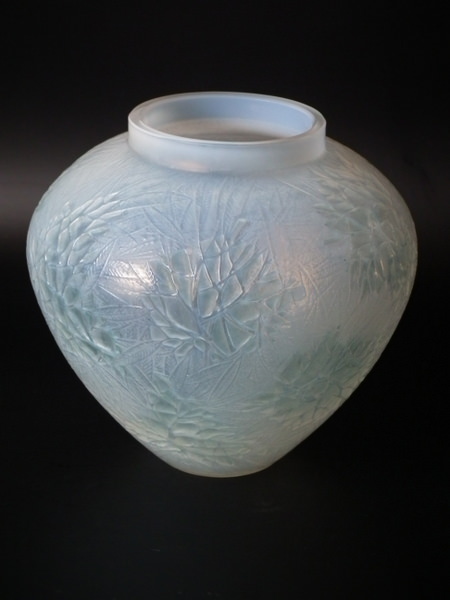 Introduced in 1923. Height: 15.4cm (6.06ins). Width: 16cm (6.3ins). Depth: 16cm (6.3ins).. Rene Lalique Cased opalescent with blue staining Glass 'Esterel' Vase. Book reference: Marcilhac 941.
