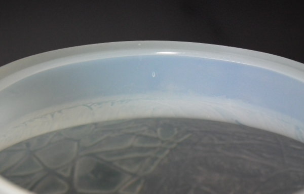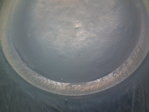 A few small glaze bubbles inside the glass, mostly visible to interior.