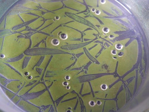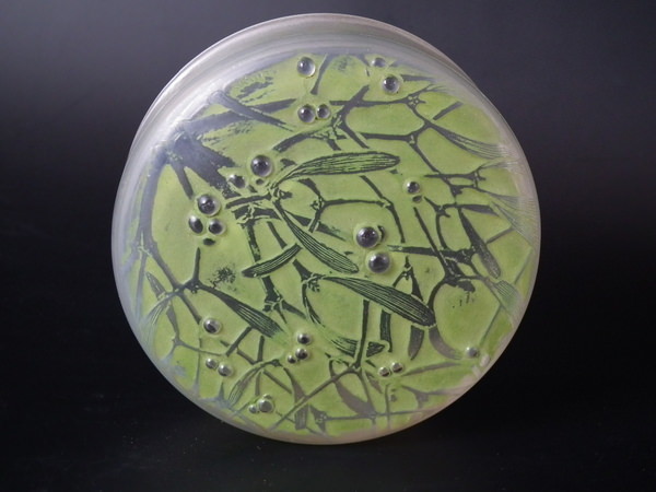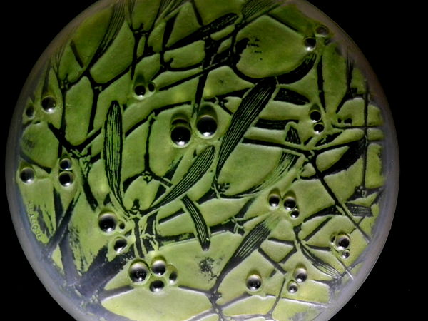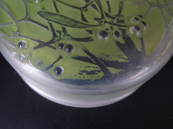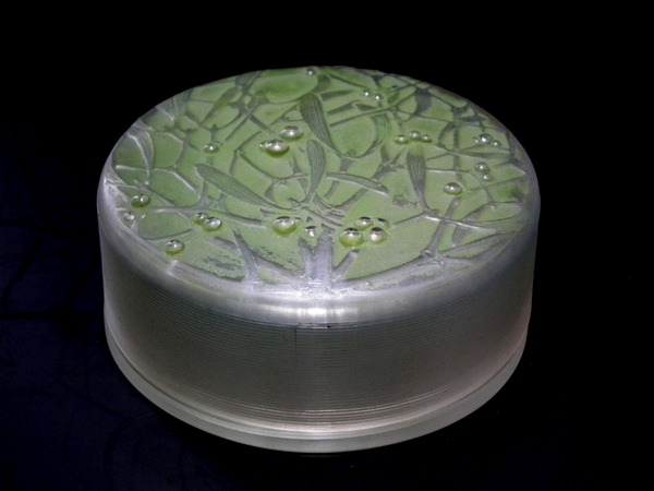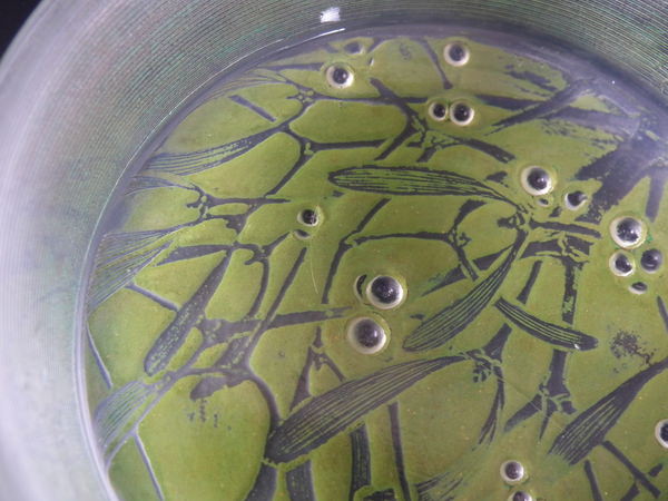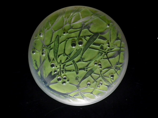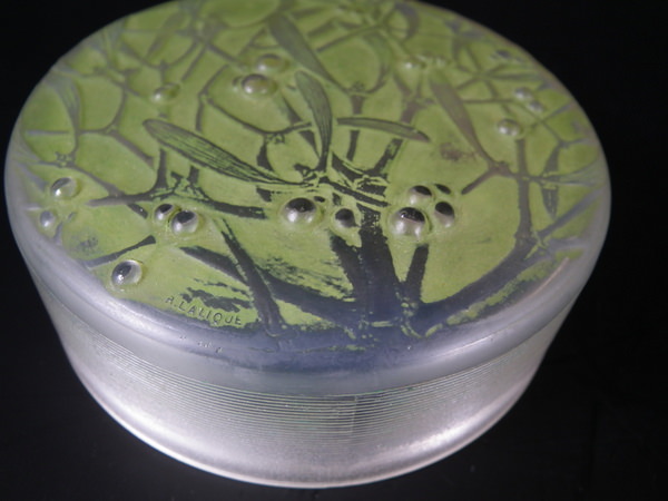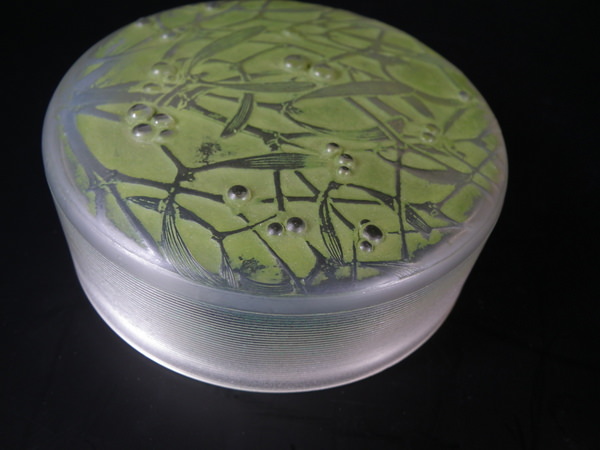 Introduced in 1920. Height: 4.5cm (1.77ins). Width: 10cm (3.94ins). Depth: 10cm (3.94ins).. René Lalique Clear with green staining Glass 'Gui ' Round Box. Book reference: Marcilhac 65.