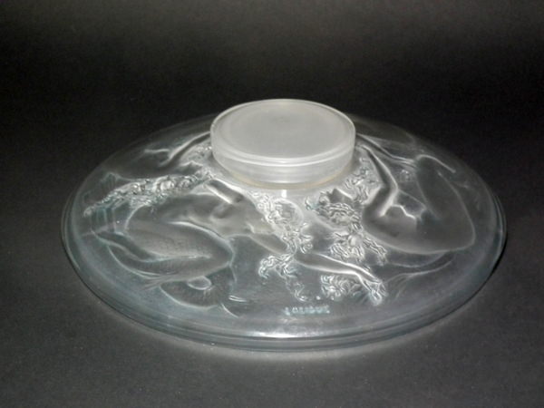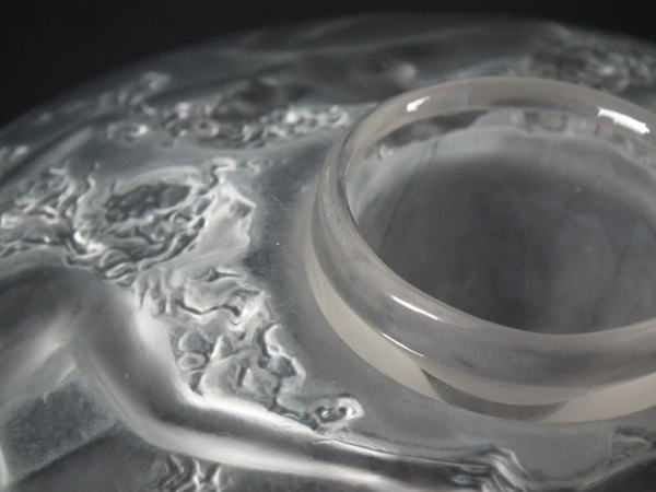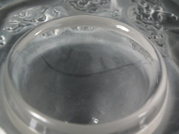 Introduced in 1920. Height: 4cm (1.57ins). Width: 16cm (1.57ins). Depth: 16cm (6.3ins). René Lalique, clear and frosted with with some staining visible, glass 'Quartre Sirenes' inkwell.