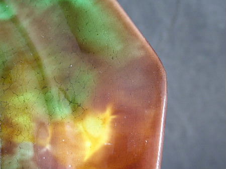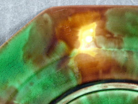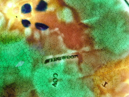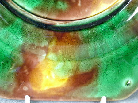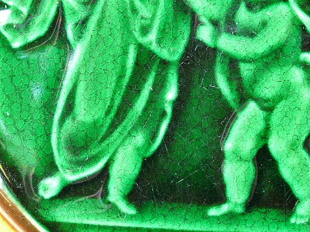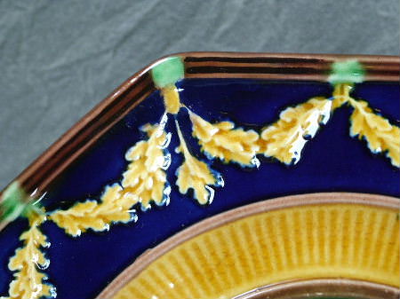 Fluted ochre band around the green center. Cobalt surround with a border of trailing oak leaves.