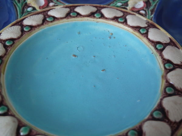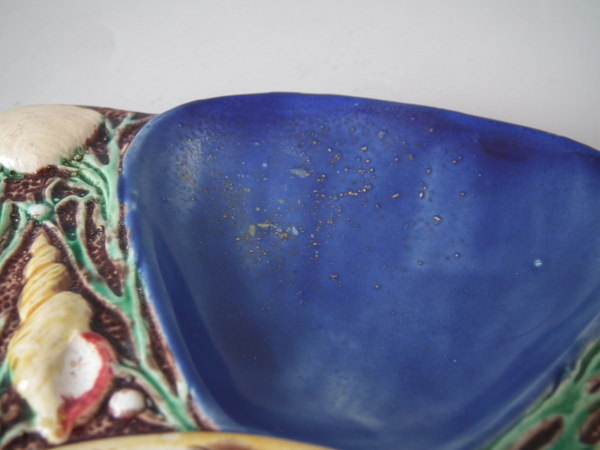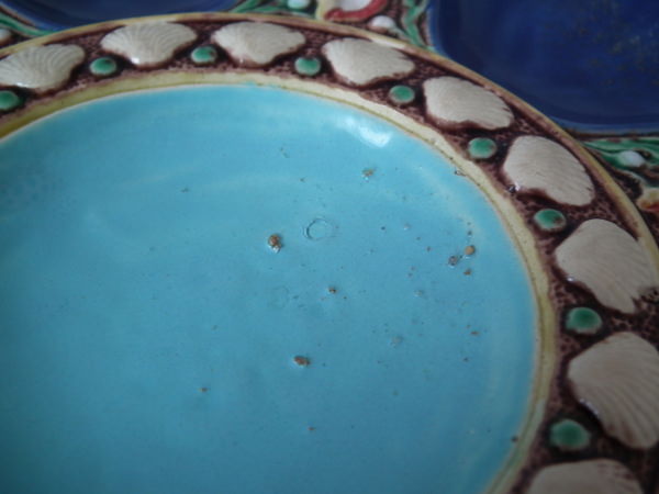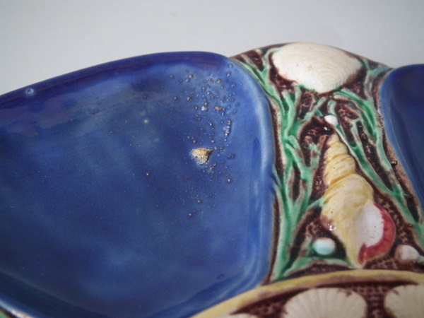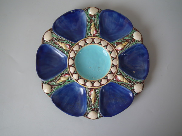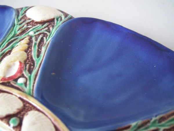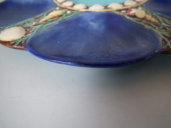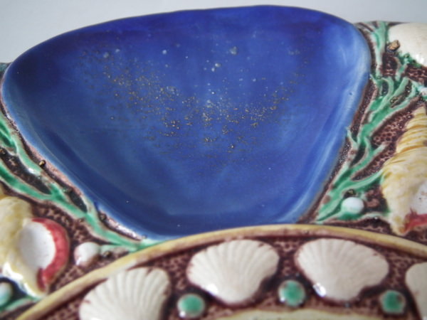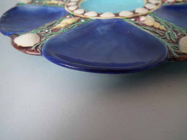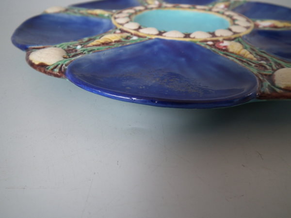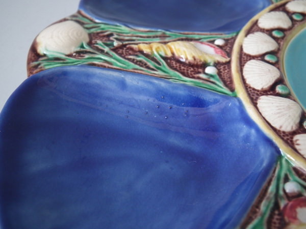 Minton Majolica oyster plate which features six shell-shaped wells surrounded by seashells. Cobalt blue ground version. Colouration: cobalt blue, turquoise, cream, are predominant.