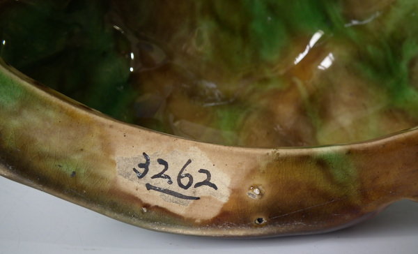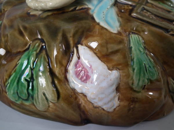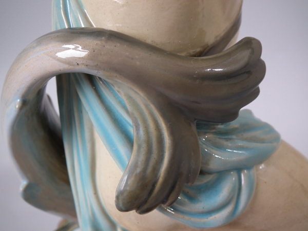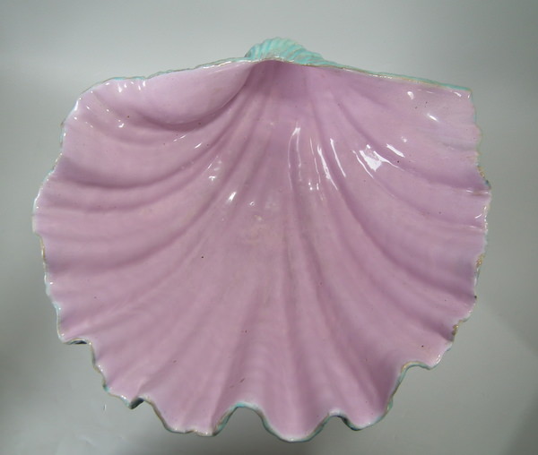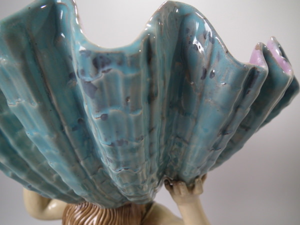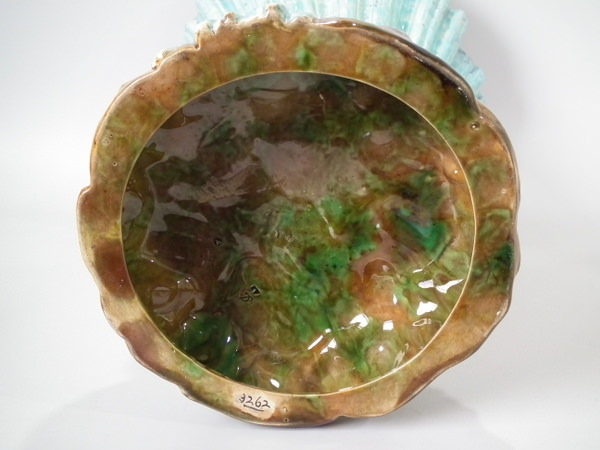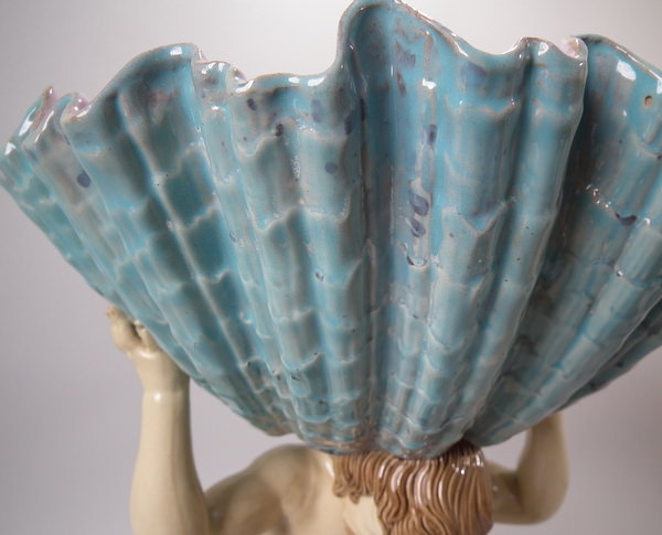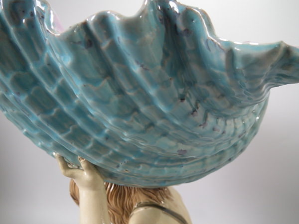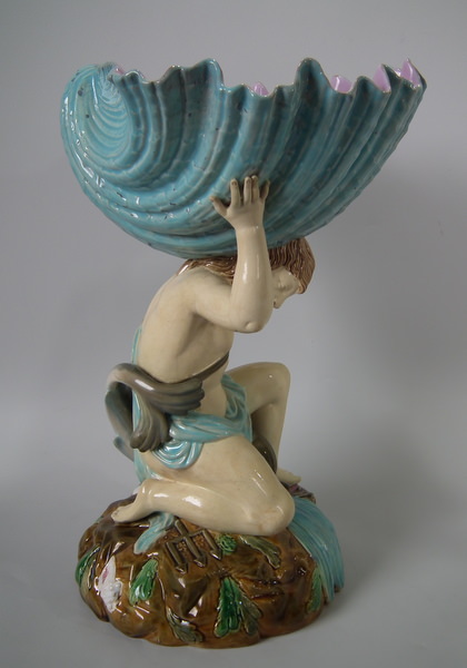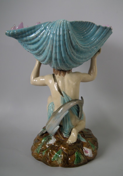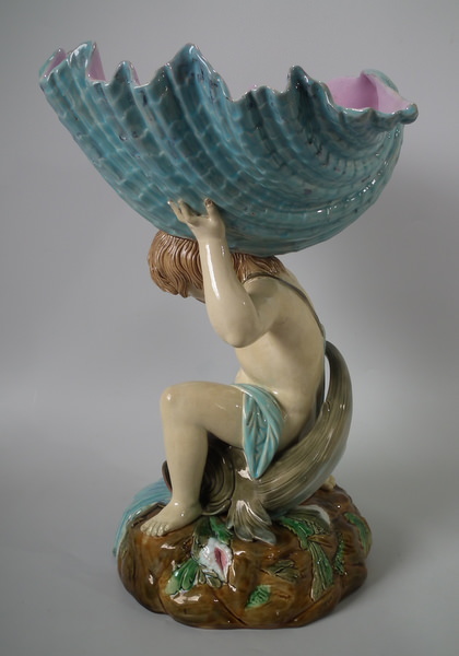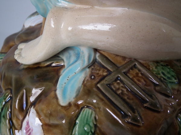 Victorian, circa 1870. 15.6ins high, 11.4ins wide, 10.2ins depth. George Jones Majolica centrepiece bowl which features Neptune holding a shell above his head accompanied by a dolphin. Colouration: turquoise, purple, cream, are predominant.