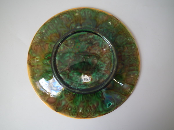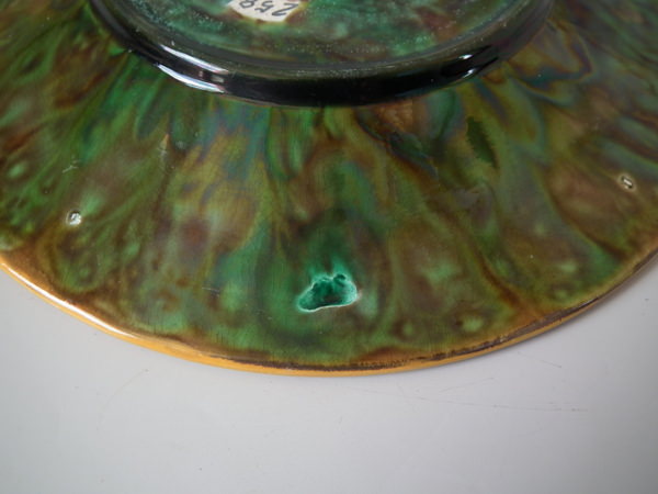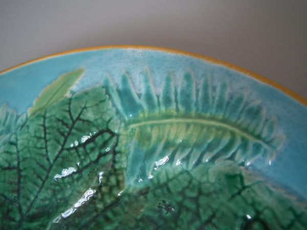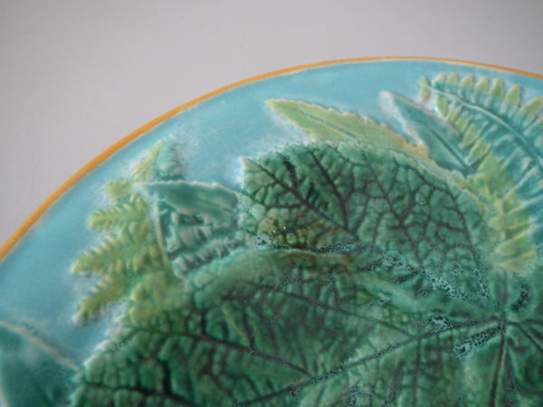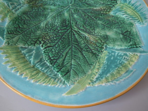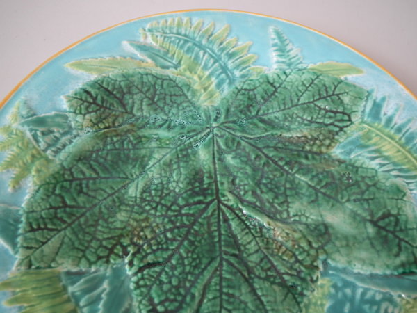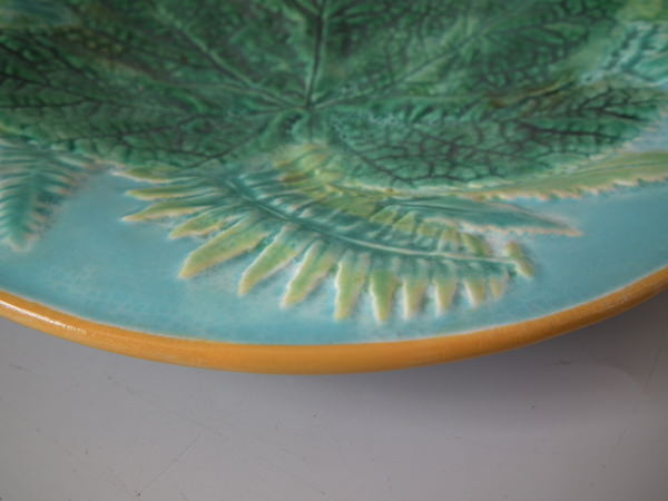 Victorian, circa 1870. 8.5ins high, 8.5ins wide, 1ins depth. George Jones Majolica plate which features a maple leaf and fern fronds.