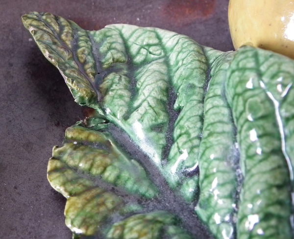Victorian, circa 1890. 10.4ins high, 10.4ins wide, 2ins depth. Avelino Soares Bello Portuguese Palissy Majolica wall plate which features loquots and leaves. Colouration: green, yellow, brown, are predominant.