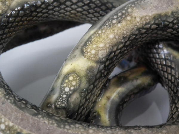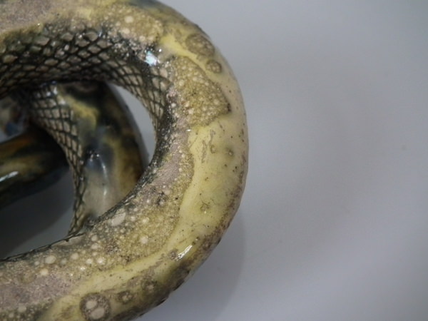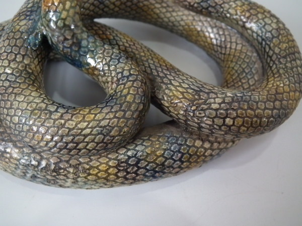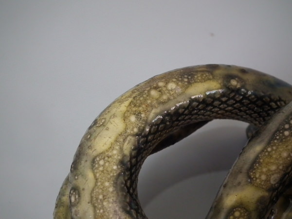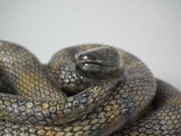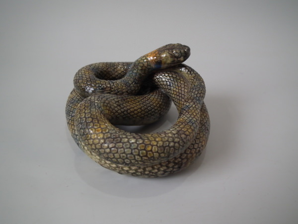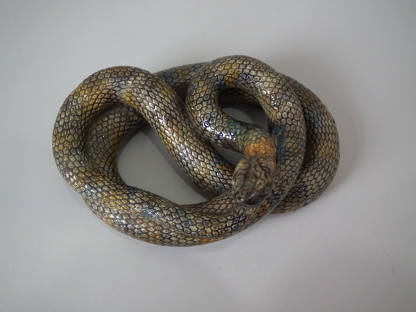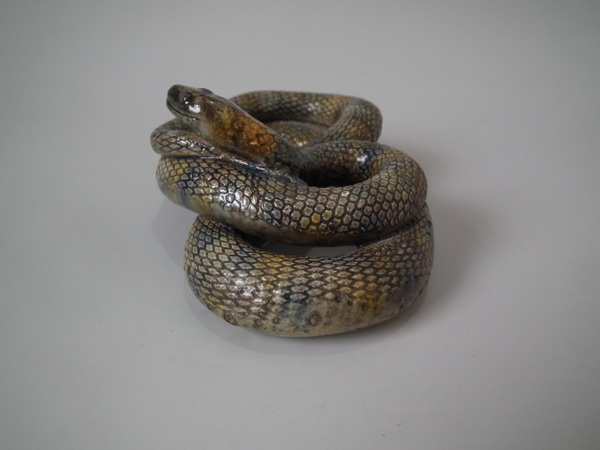 Victorian, circa 1890. 2ins high, 4.7ins wide, 3.3ins depth. Portuguese Palissy Majolica figural which features a coiled snake.
