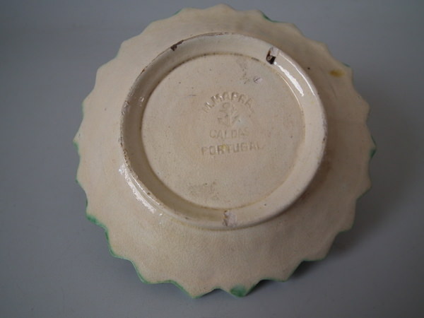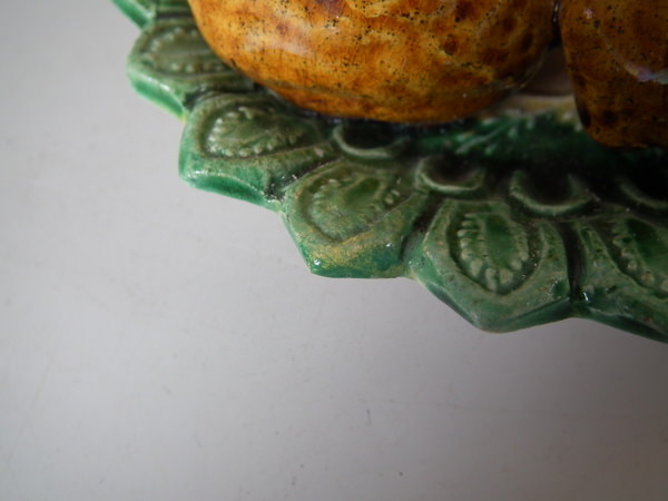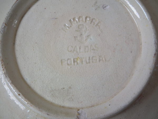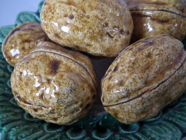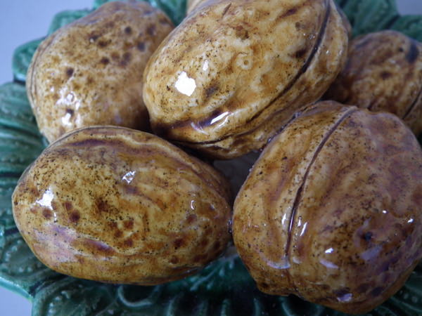 Mafra Palissy Majolica plate which features walnuts. Colouration: green, brown, are predominant. The piece bears maker's marks for the Mafra pottery.