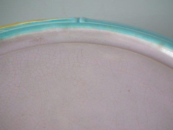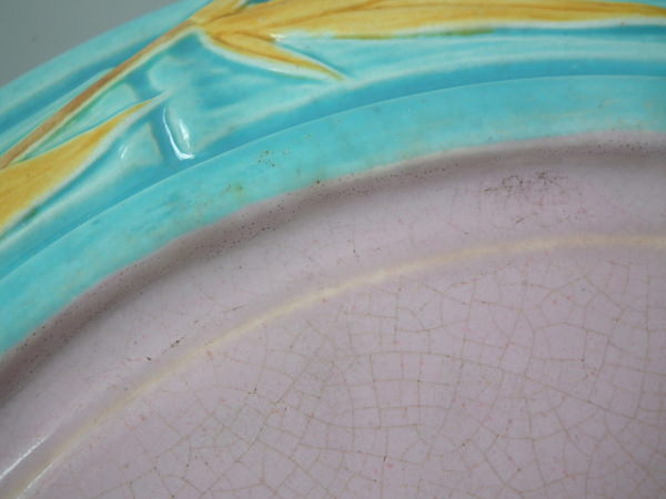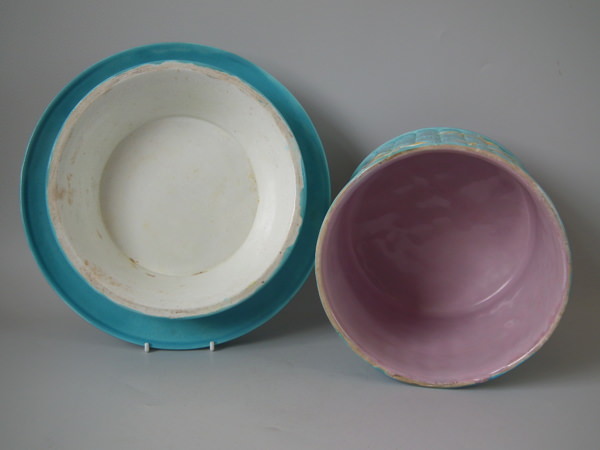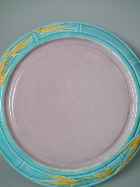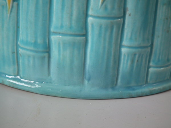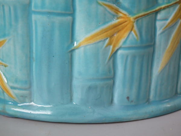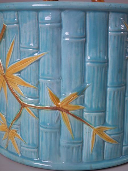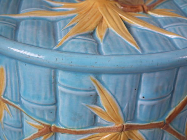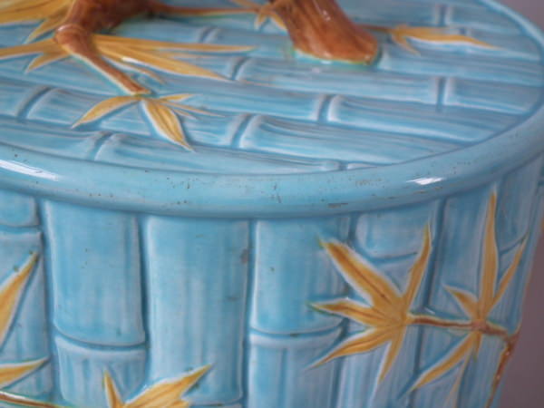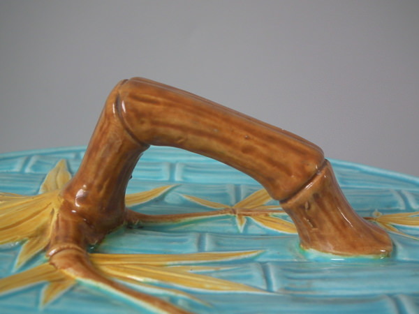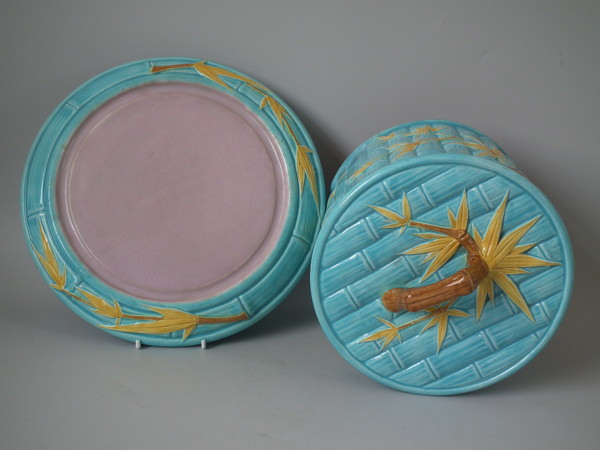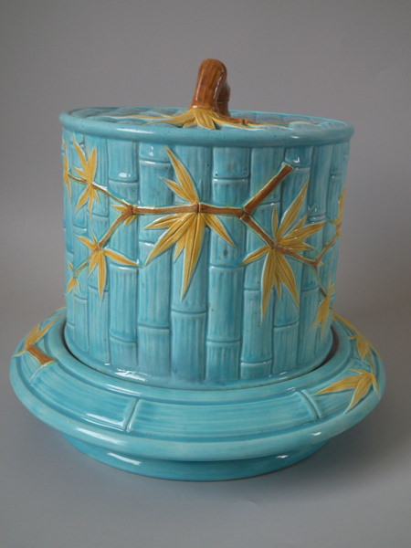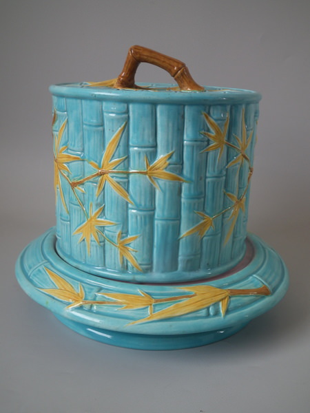 Victorian, circa 1885. 10.2ins high, 11.4ins wide, 11.4ins depth. Royal Worcester Majolica cheese keep which features bamboo decoration and handle.