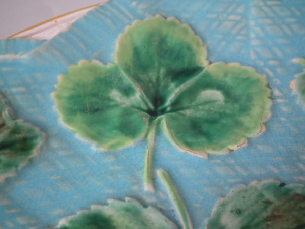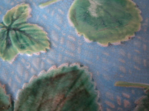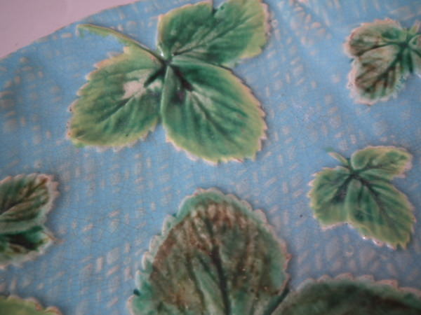 George Jones Majolica plate which features strawberry leaves laid on a napkin. Turquoise ground version. Colouration: turquoise, green, white, are predominant.