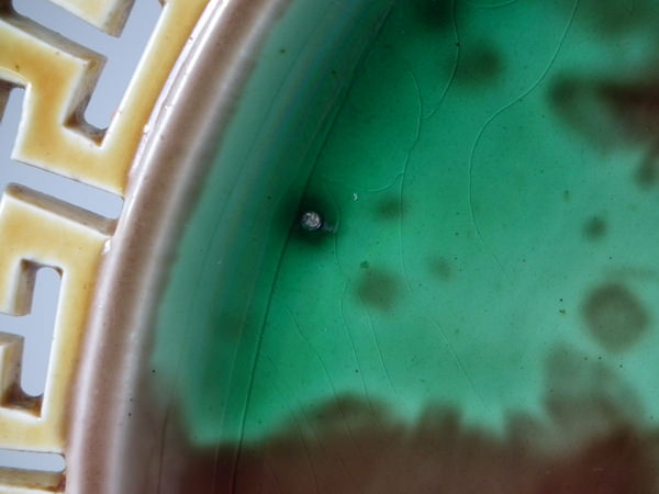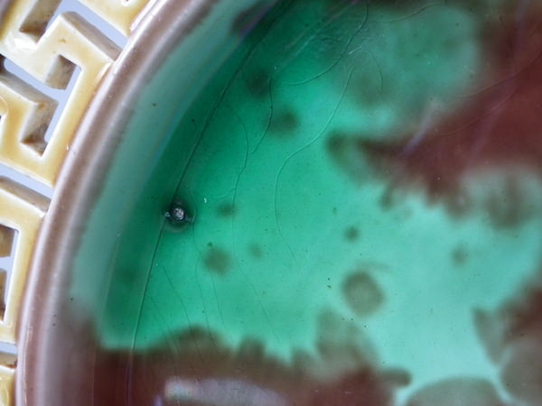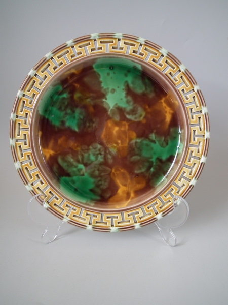 Victorian, circa 1868. 8.5ins high, 8.5ins wide, 0.6ins depth. Wedgwood Majolica plate which features a Greek key reticulated border. Colouration: ochre, brown, green, are predominant.