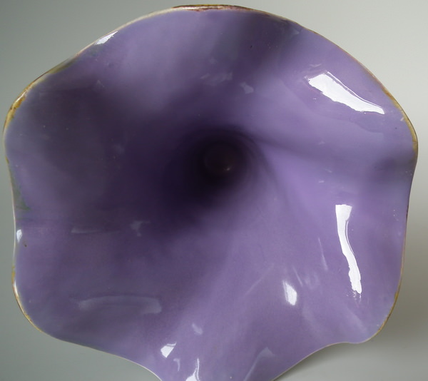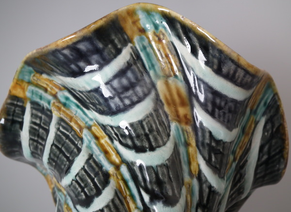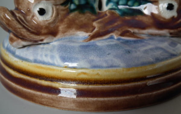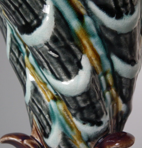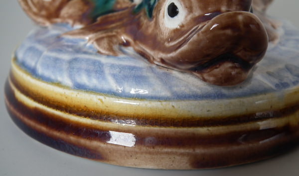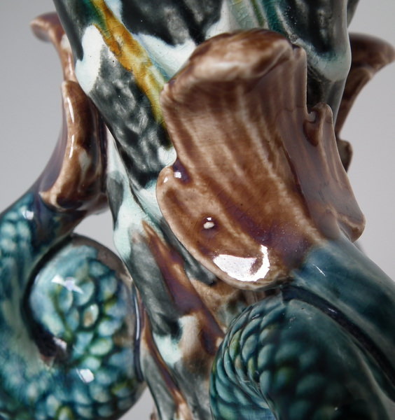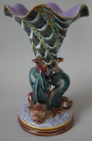Victorian, circa 1884. 9.4ins high, 4.7ins wide, 4.7ins depth. Gustafsberg Majolica vase which features three fish. Lilac ground version. Colouration: lilac, green, brown, are predominant.