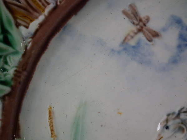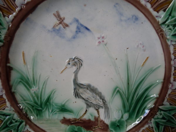 Victorian, circa 1869. 9.2ins high, 9.2ins wide, 1.1ins depth. Wedgwood Majolica plate which features a heron at the edge of a pond. Designed by Joseph Theodore Deck. Colouration: cream, ochre, green, are predominant.