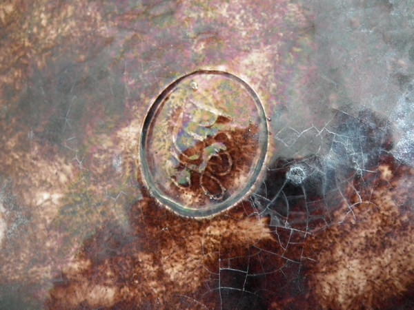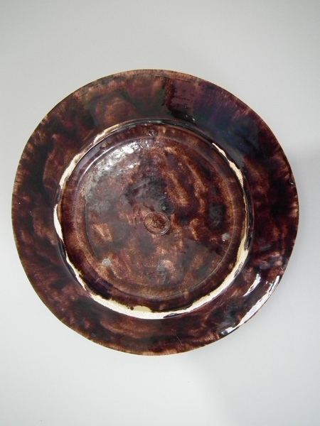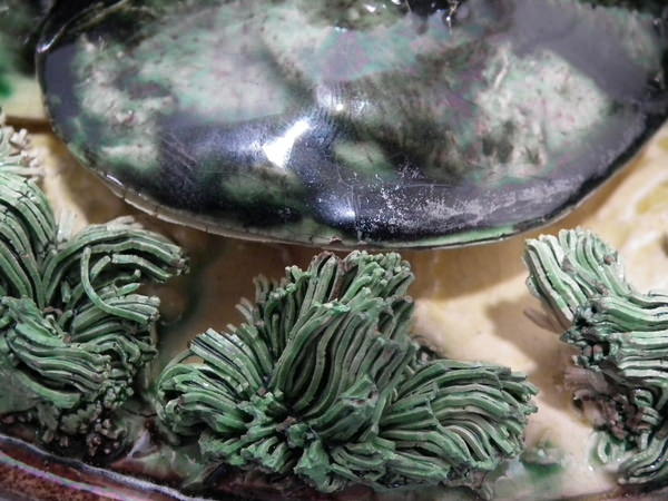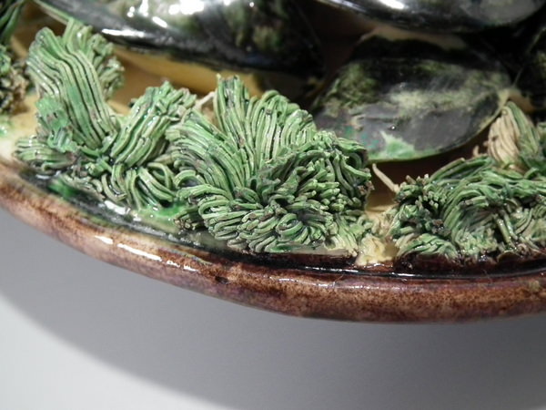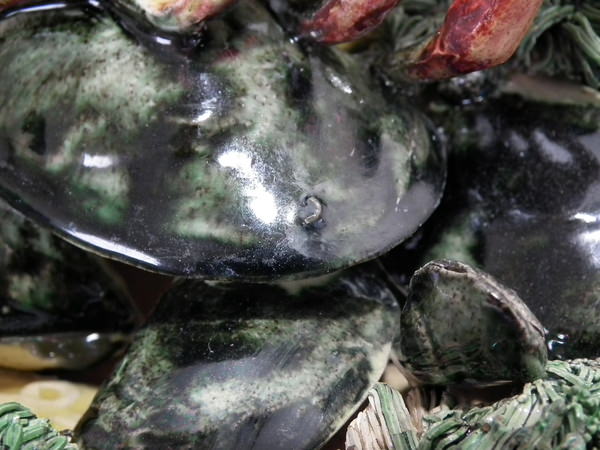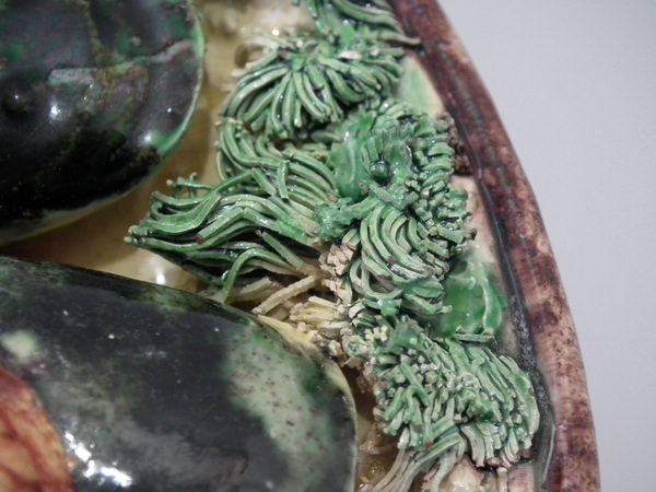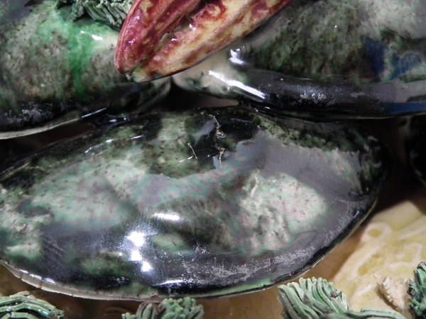 KILN EFFECTS: specks of kiln detritus caught in the glaze to some of the shell fish and to the reverse.