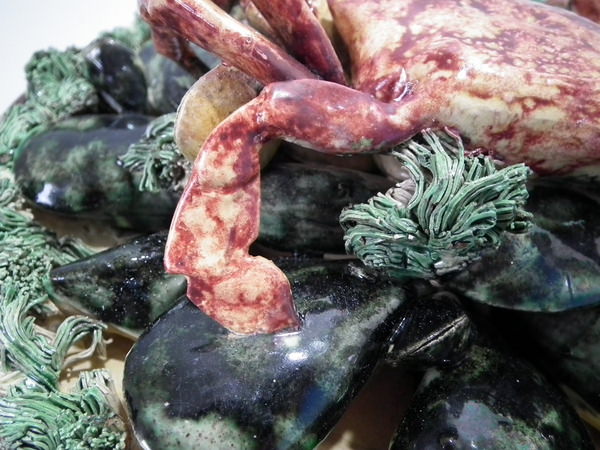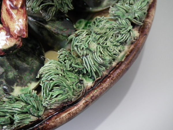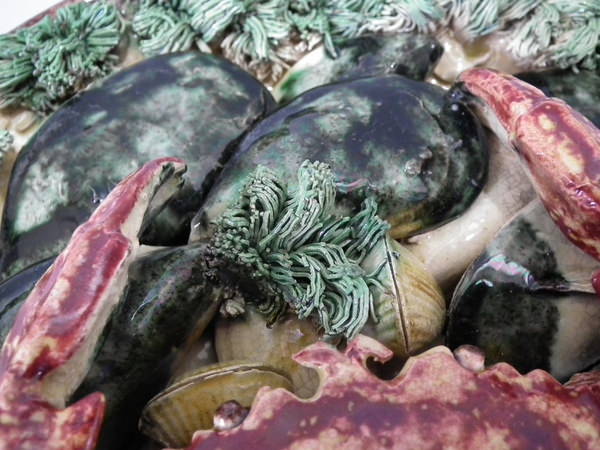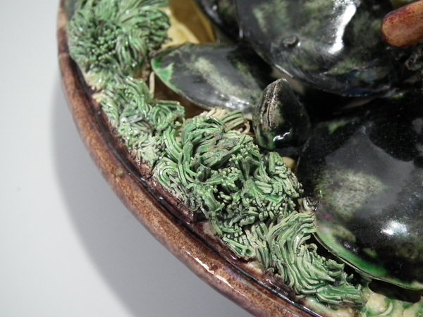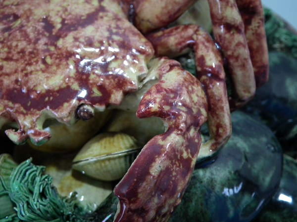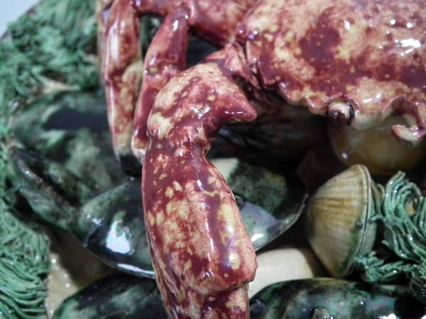 Victorian, circa 1890. 10.4ins high, 10.4ins wide, 4.3ins depth. Jose Francisco de Sousa Portuguese Palissy Majolica wall plate which features a crab, mussels and clams.
