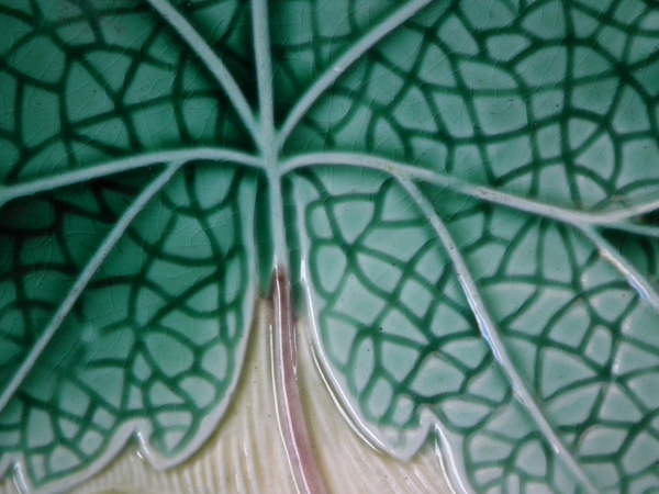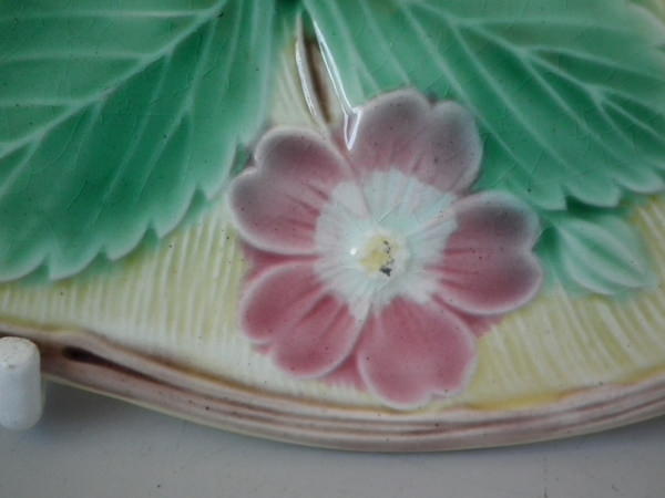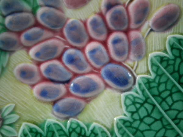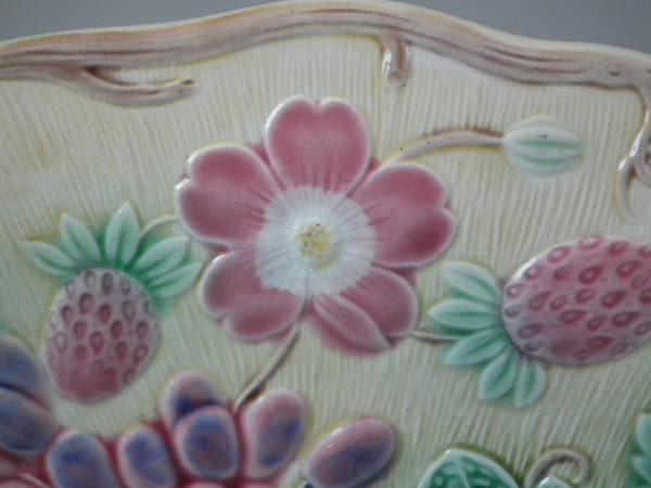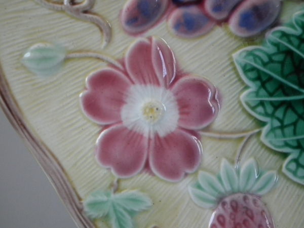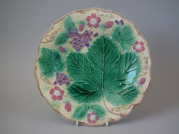 Early to mid 20thC, circa 1929. 9.1ins high, 9.1ins wide, 1ins depth. Wedgwood Majolica plate which features strawberries, leaves, grapes and blossoms.