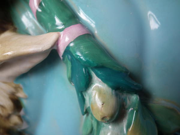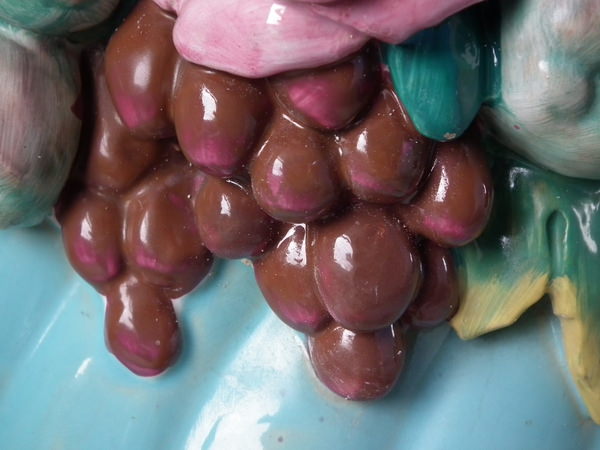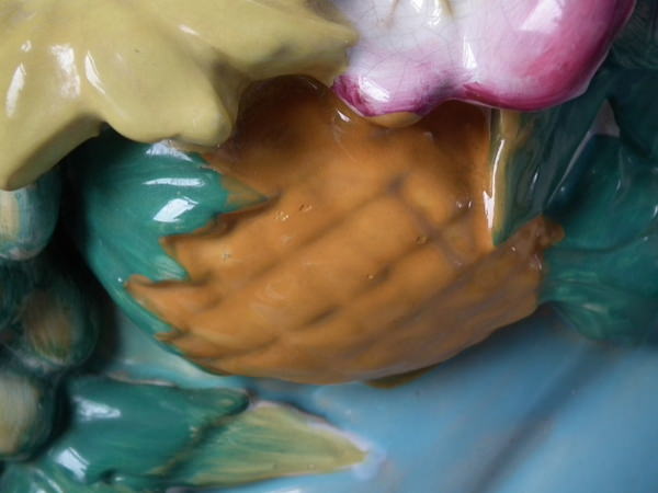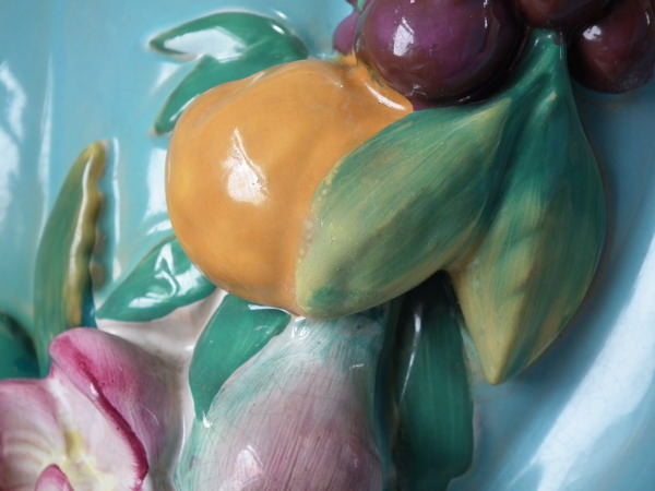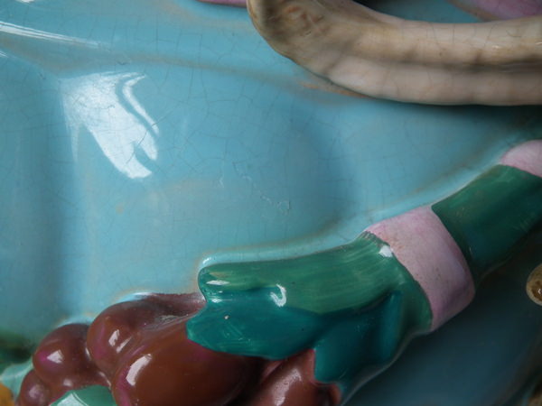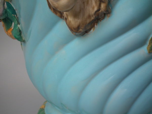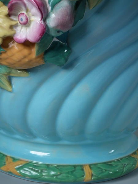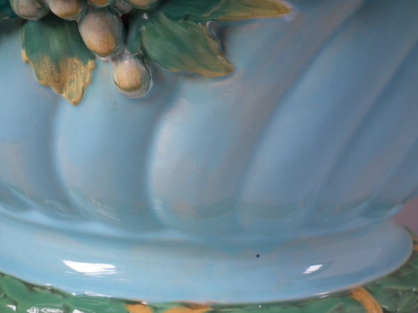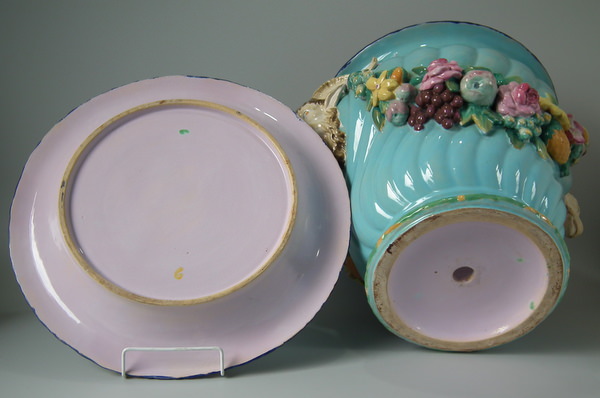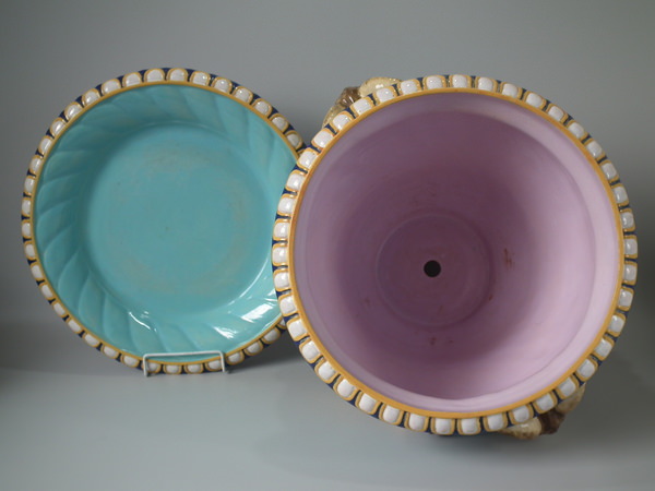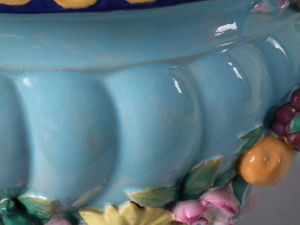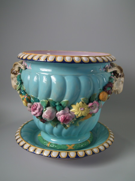 Minton Majolica jardinière and stand which features ram's head handles and fruit swags.