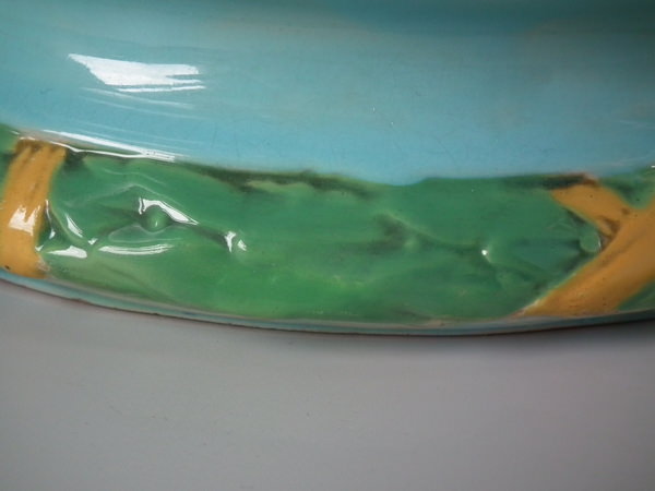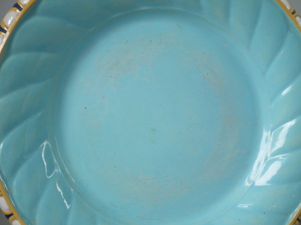 KILN EFFECTS: uneven glaze application to turquoise ground and interior;