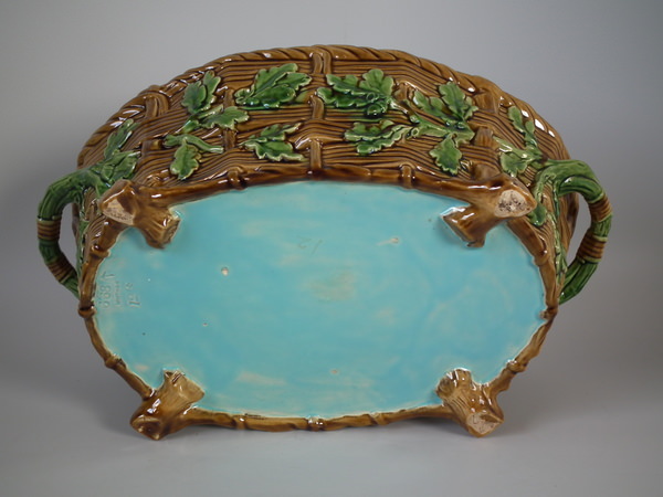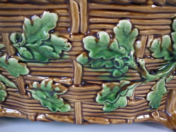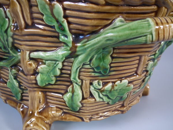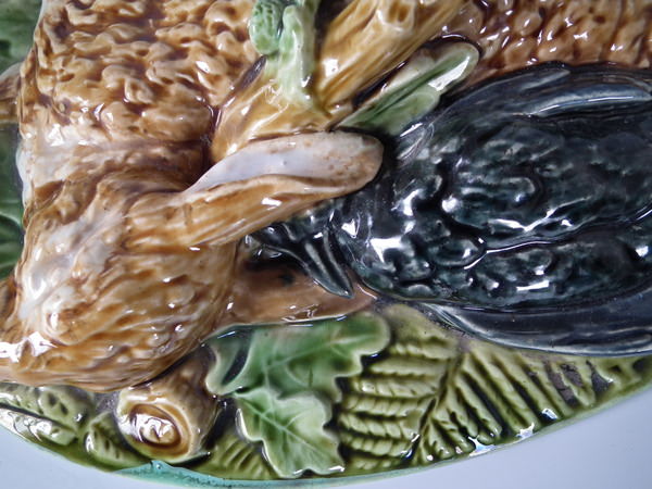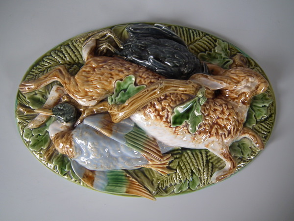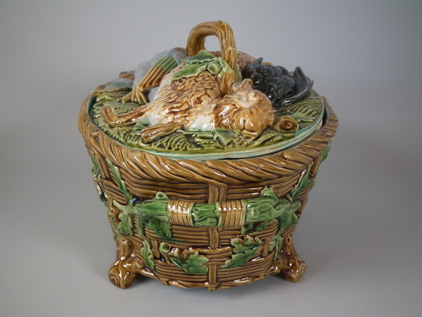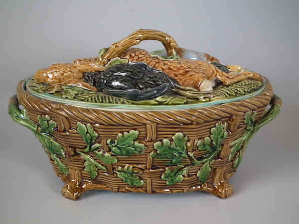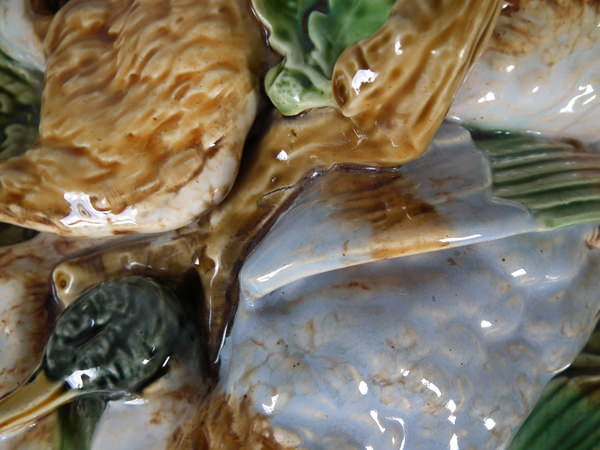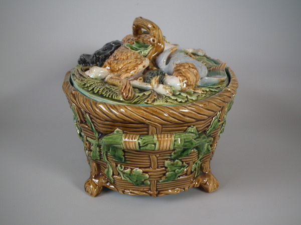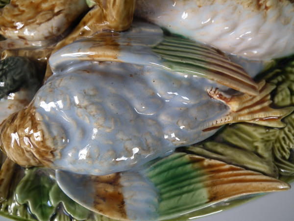 Victorian, circa 1874. 7.5ins high, 14ins wide, 8.7ins depth. Minton Majolica game pie dish with liner which features a mallard, rabbit and blackbird.