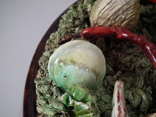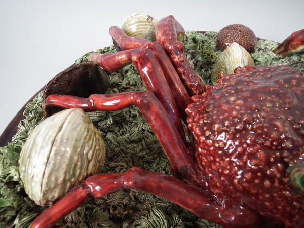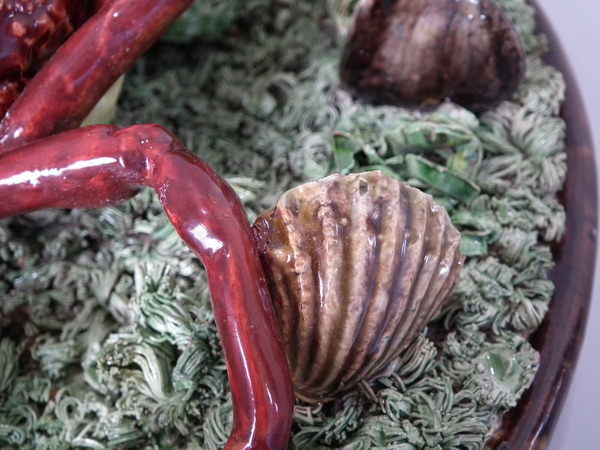 Victorian, circa 1890. 15ins high, 15ins wide, 3.9ins depth. Jose Francisco de Sousa Portuguese Palissy Majolica wall charger which features a large spider crab and a variety of shellfish.