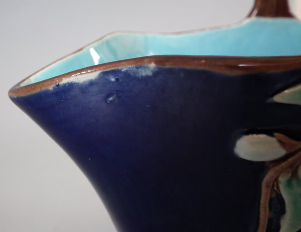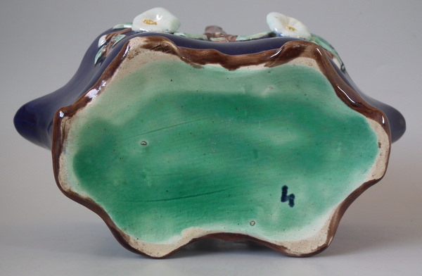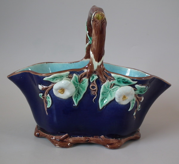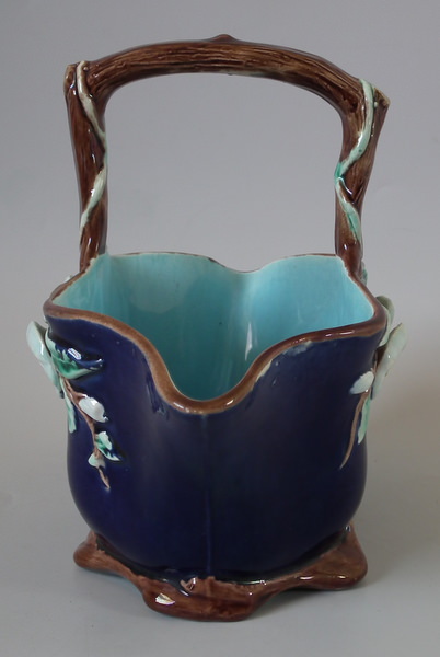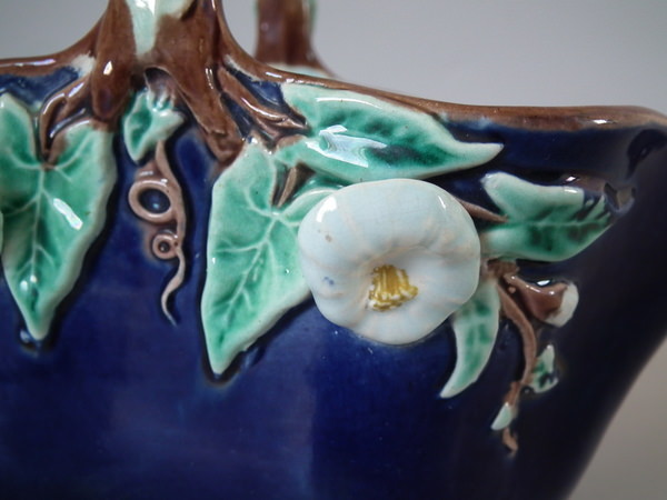 Victorian, circa 1870. 6.1ins high, 7.6ins wide, 4.3ins depth. Holdcroft Majolica basket which features sides decorated with white flowers and brown and green foliage. Cobalt blue ground version. Colouration: cobalt blue, brown, turquoise, are predominant.