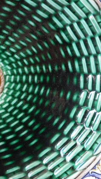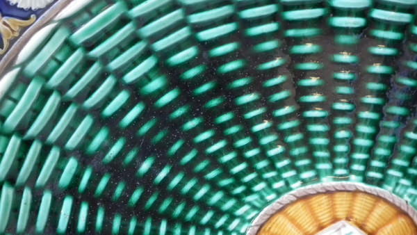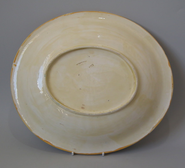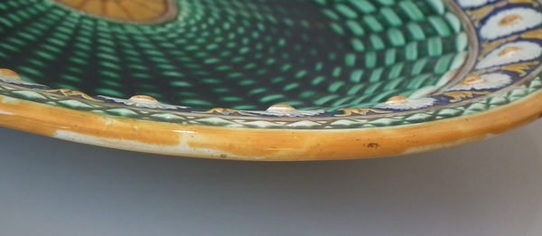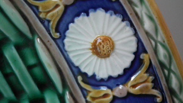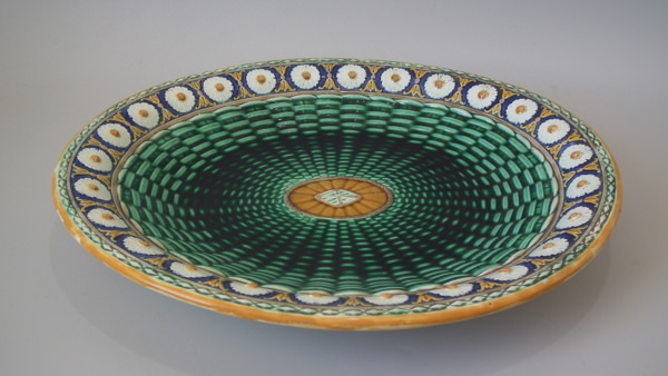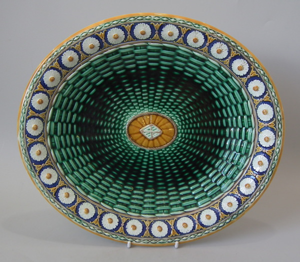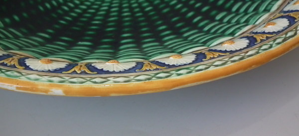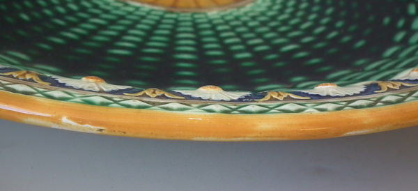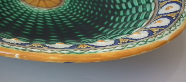 Wedgwood Majolica platter which features a daisy border. Colouration: cobalt blue, green, ochre, are predominant.