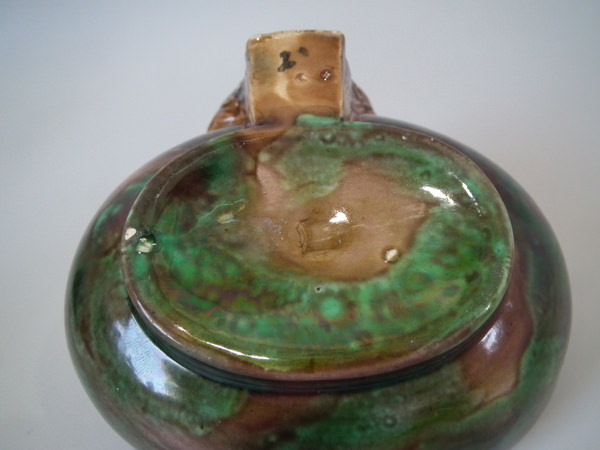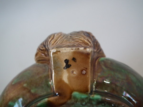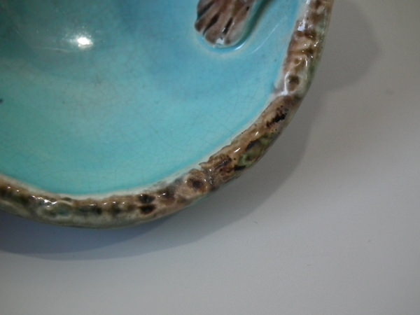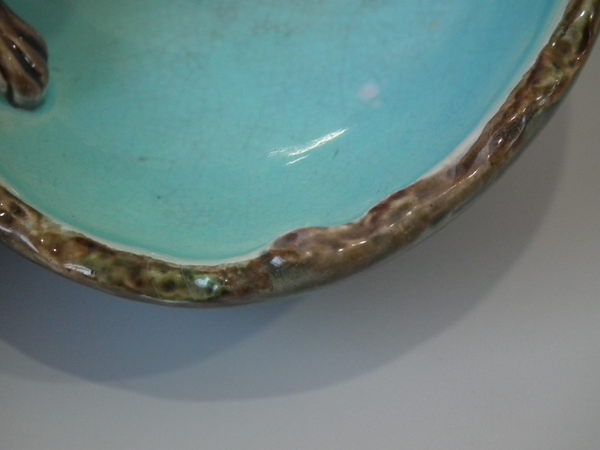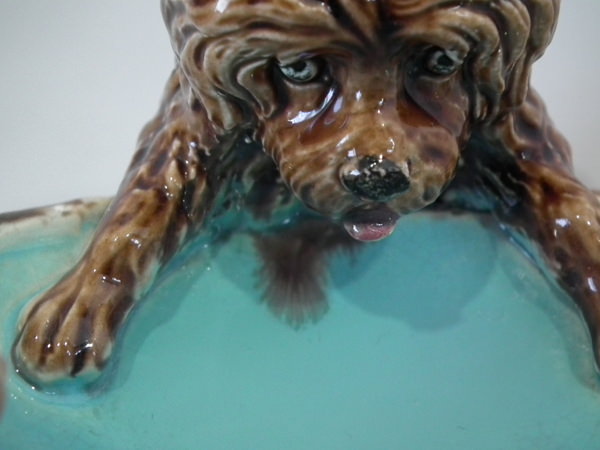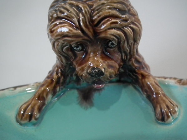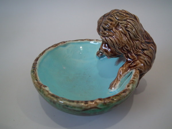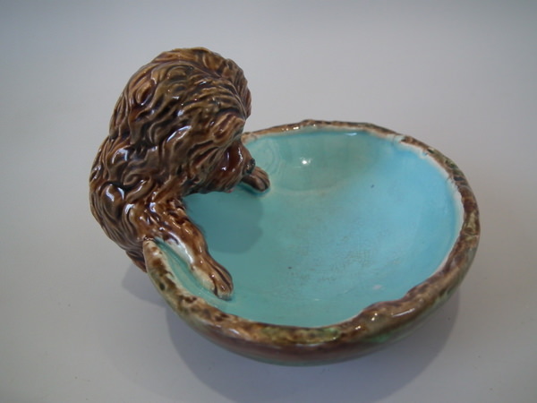 Victorian, circa 1870. 2.8ins high, 4.1ins wide, 3.9ins depth. George Jones Majolica dish which features a dog to the rim. Colouration: turquoise, green, brown, are predominant.