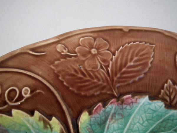 Victorian, circa 1870. 9.1ins high, 9.1ins wide, 1.2ins depth. Majolica plate which features strawberry leaves, strawberries, flowers and grapes.