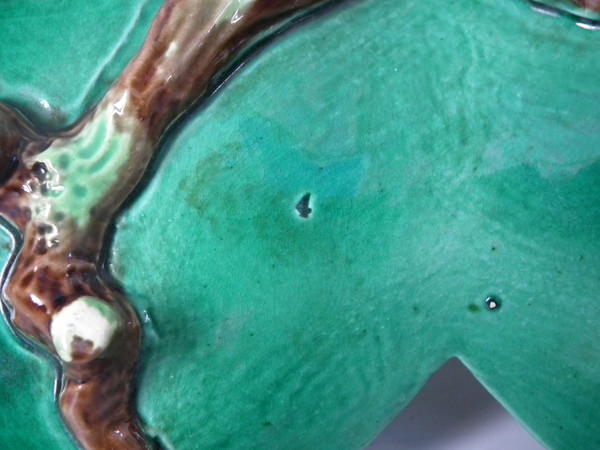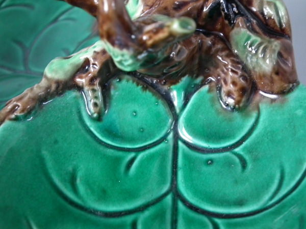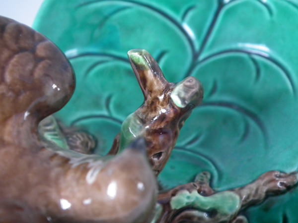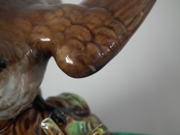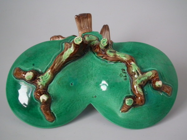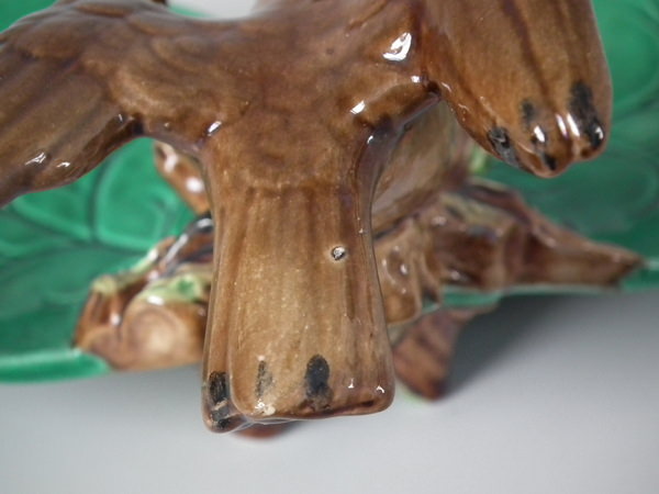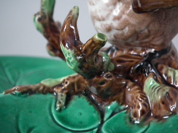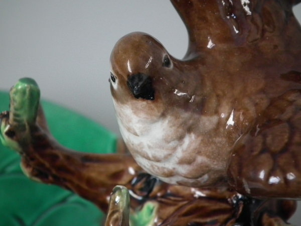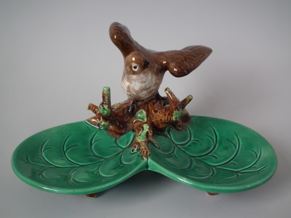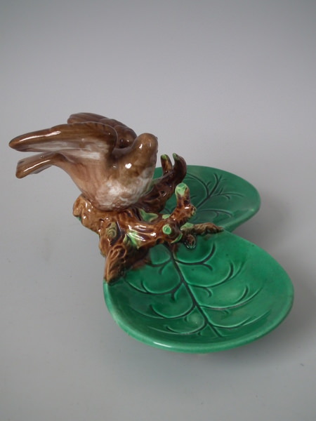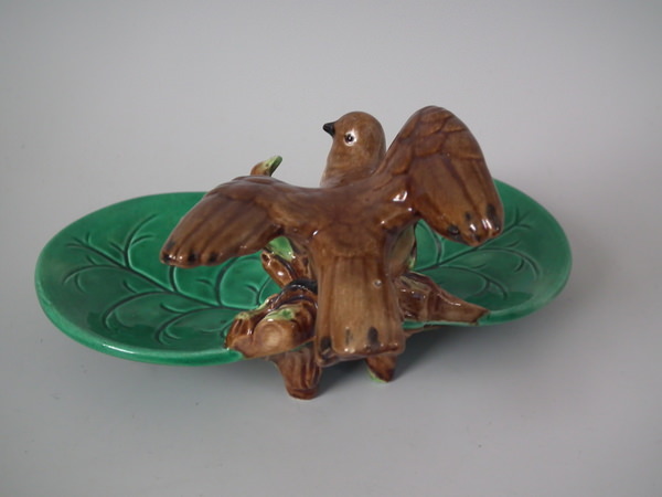 Victorian, circa 1870. 3.1ins high, 5.7ins wide, 4.5ins depth. George Jones Majolica ring holder which features a bird perched on a branch above lily leaves. Colouration: green, brown, cream, are predominant.