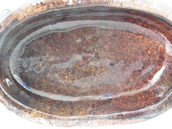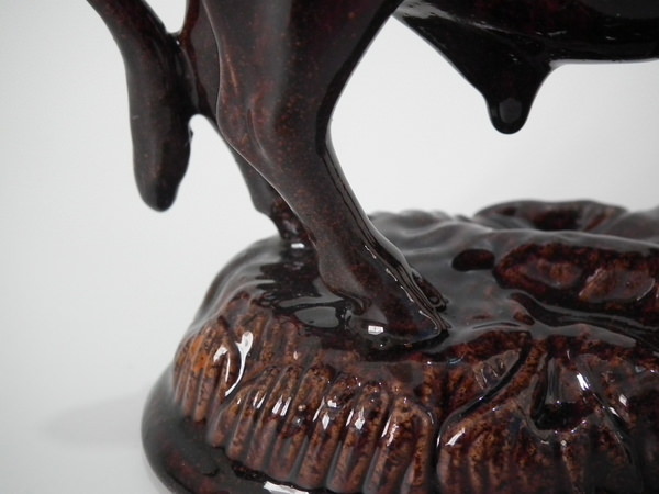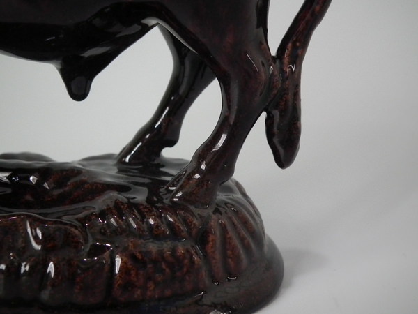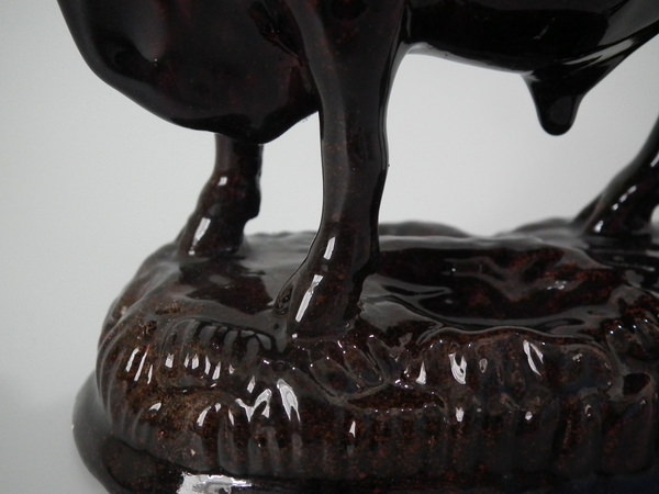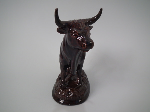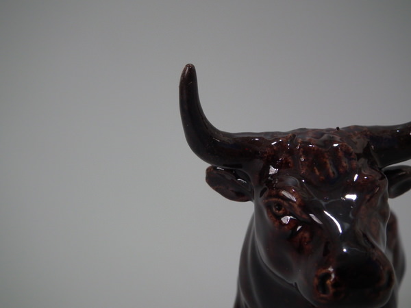 CONDITION: Fair. KILN EFFECTS: piece of kiln detritus caught in the glaze to the top of the bull's head.