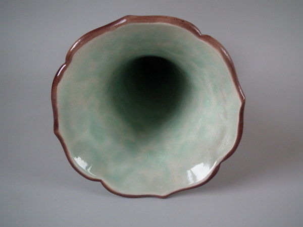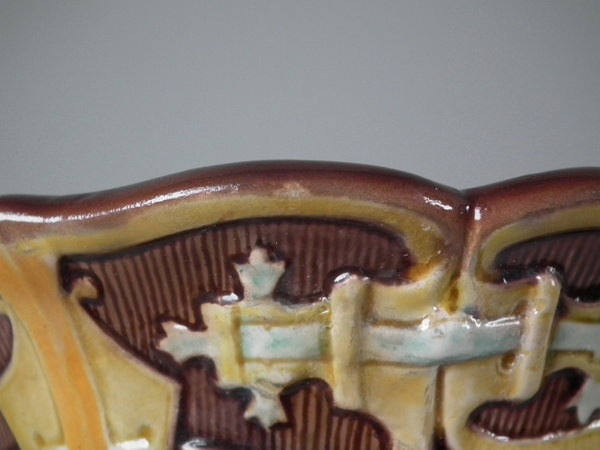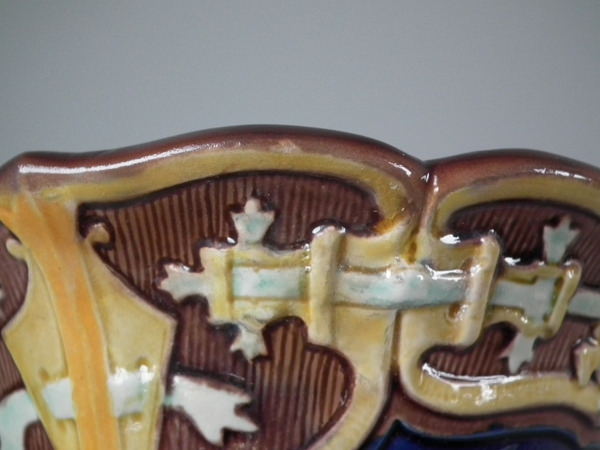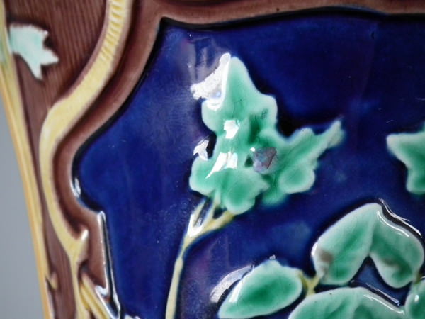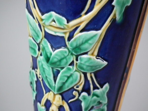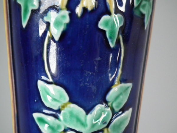 Victorian, circa 1869. 10.8ins high, 4.9ins wide, 4.9ins depth. Wedgwood Majolica vase which features trailing ivy. Colouration: cobalt blue, ochre, brown, are predominant.