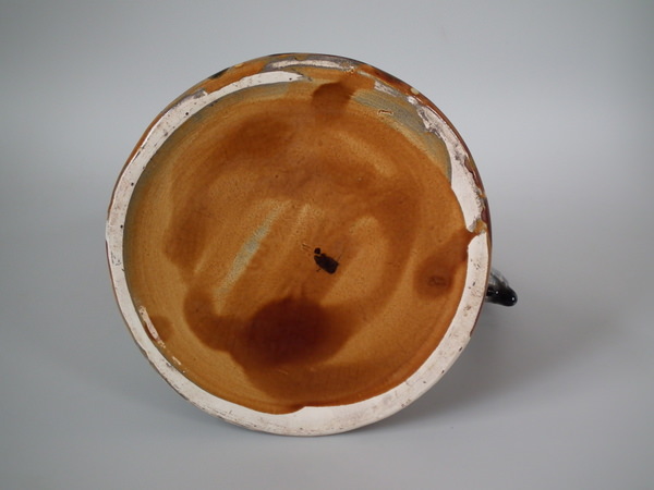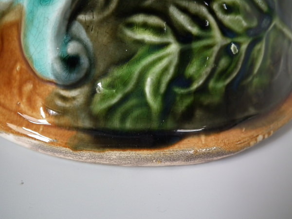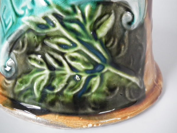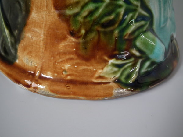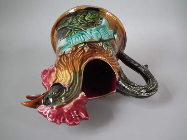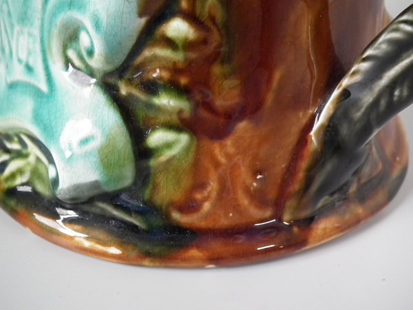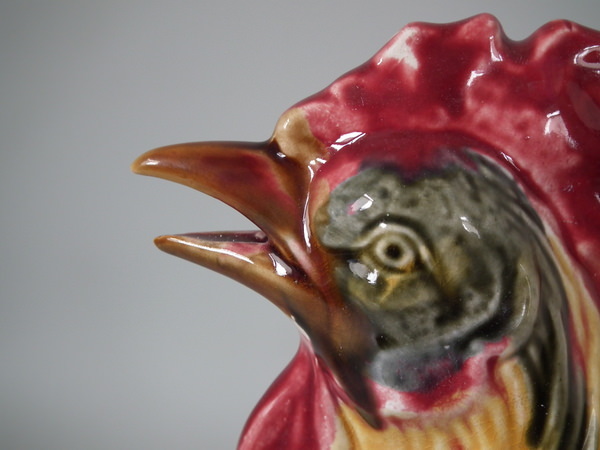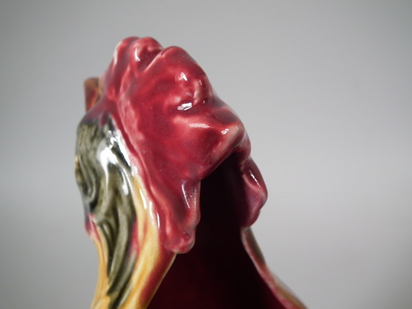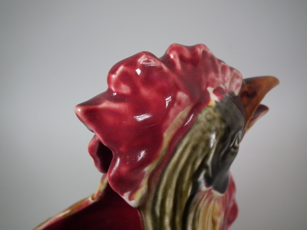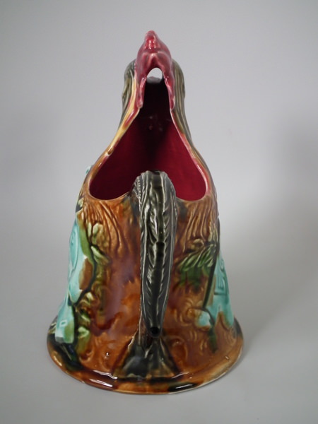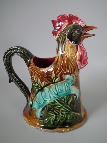 Circa 1900. 9.6ins high, 7.7ins wide, 6.1ins depth. Onnaing Majolica jug/pitcher which features a cockerel
