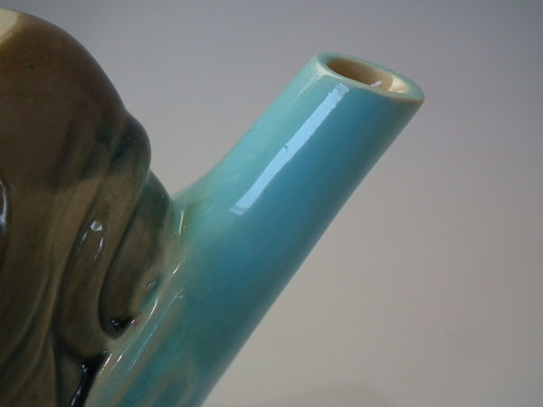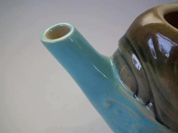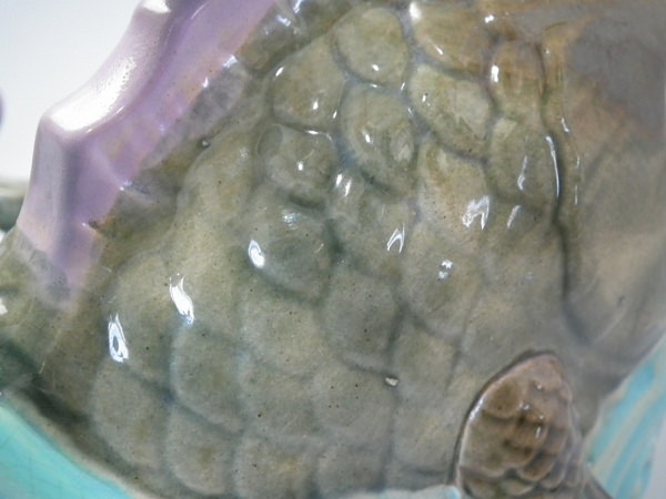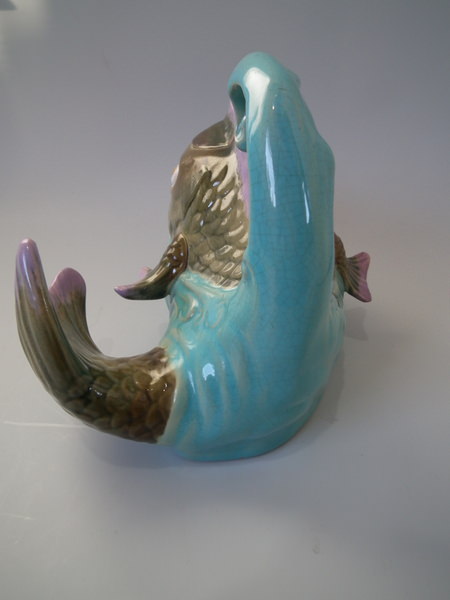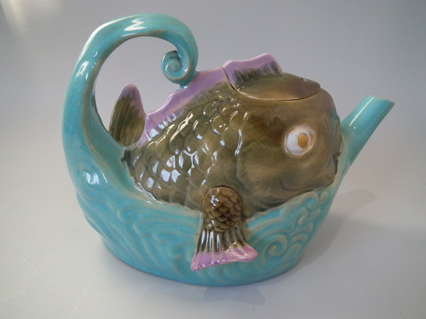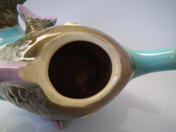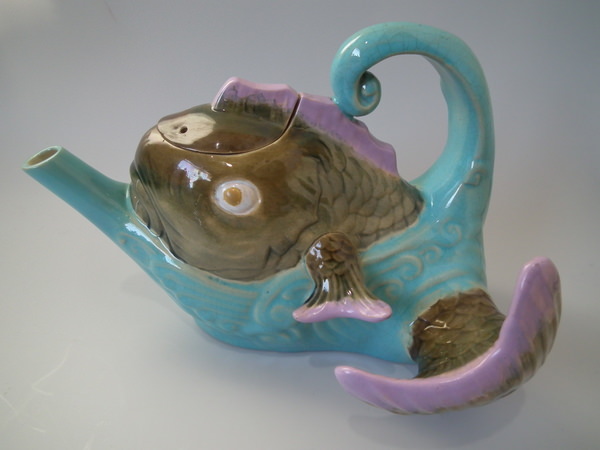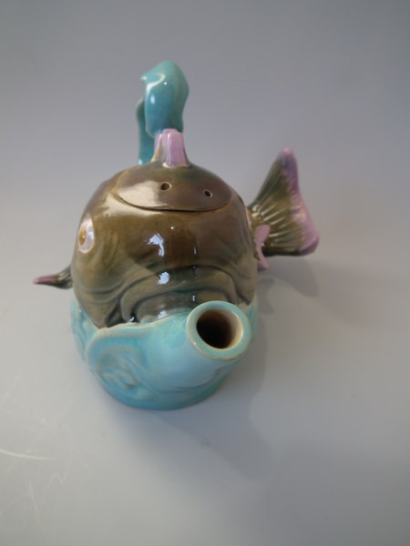 Victorian, circa 1880. 5.3ins high, 7.3ins wide, 5.5ins depth. Brownfield Majolica teapot which features a fish leaping out of the sea. Colouration: turquoise, green, lilac, are predominant.