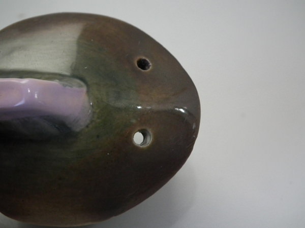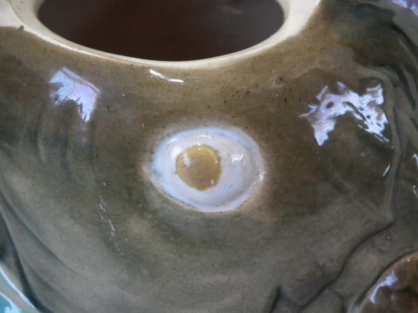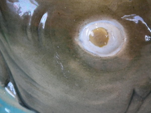KILN EFFECTS: kiln grit caught in the glaze to the fish's body.