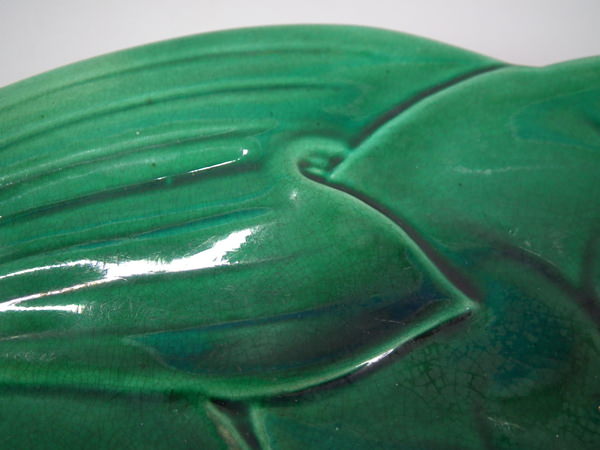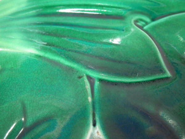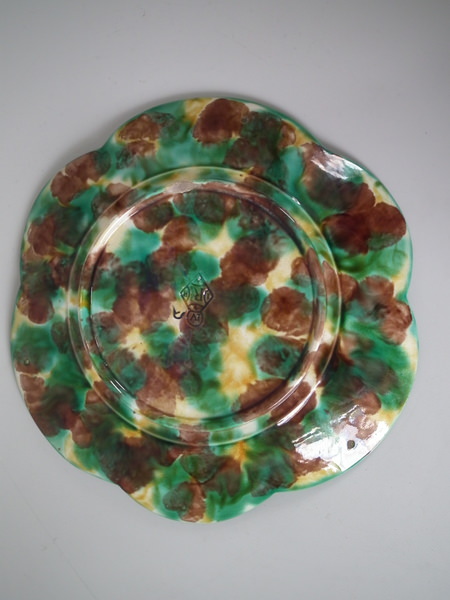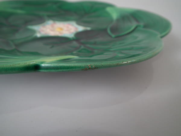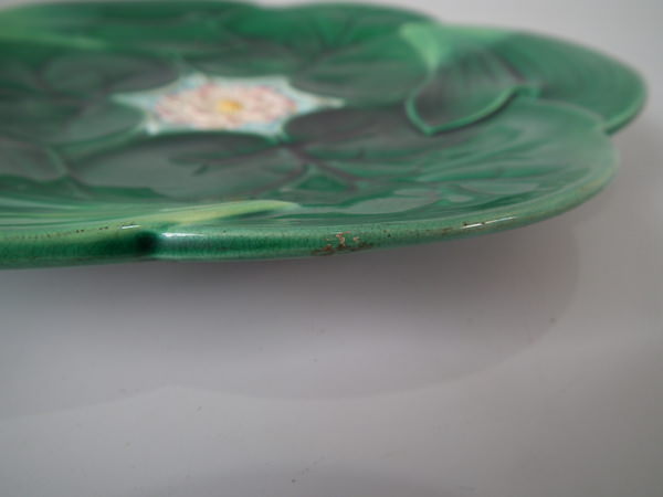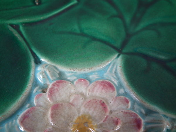 George Jones Majolica plate which features a pond lily flower surrounded by overlapping leaves. Colouration: green, pink, turquoise, are predominant.