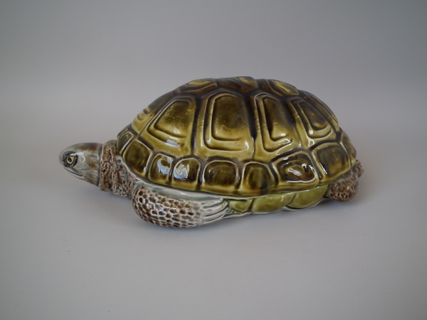 Victorian, circa 1890. 3.9ins high, 9.4ins wide, 5.5ins depth. Eichwald Majolica trinket box which features a tortoise.