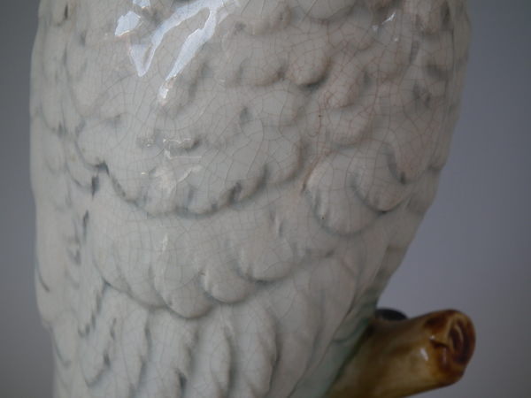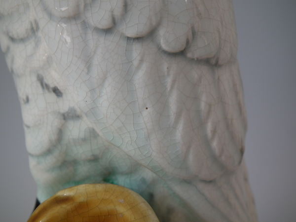 Victorian, circa 1870. 13.8ins high, 4.5ins wide, 4.3ins depth. Minton Majolica figural which features a cockatoo perched on a tree stump.