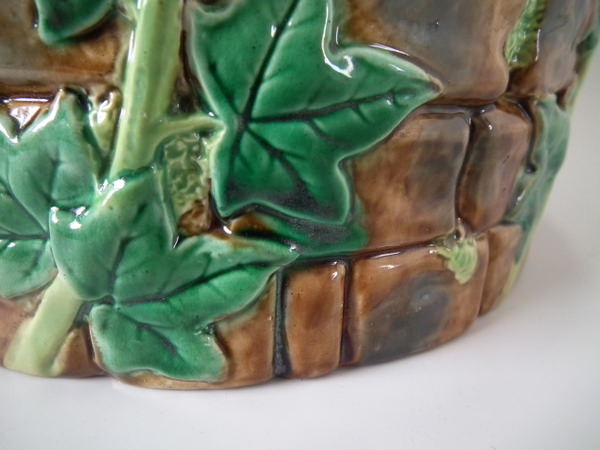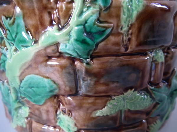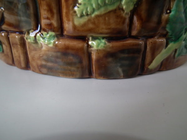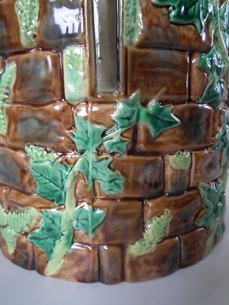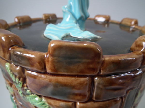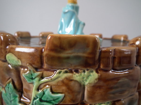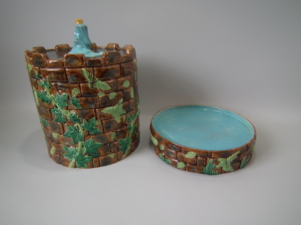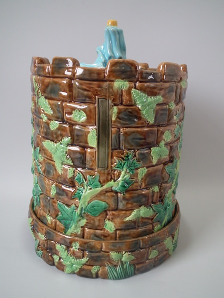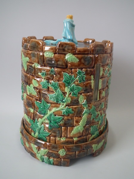 Victorian, circa 1873. 5.1ins high, 9.1ins wide, 9.1ins depth. George Jones Majolica cheese keep which features a castle tower with flag finial and a brick effect exterior.
